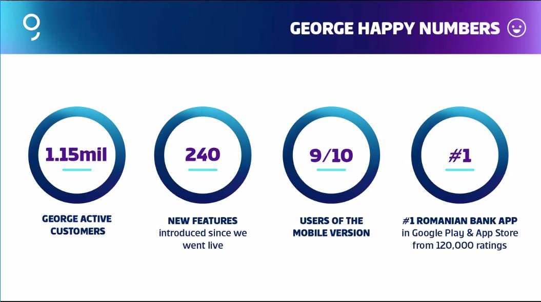 George este aplicația bancară cu cel mai mare rating din România, în magazinele App Store și Google Play, iar 9 din 10 clienți folosesc varianta de mobil George. Asta ne demonstrează că George este cu adevărat primul banking inteligent cu care se identifică clienții.