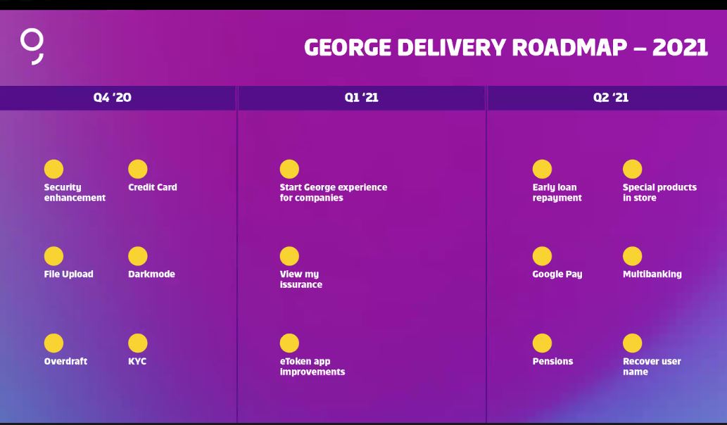 Dacă în primul trimestru din 2021 a fost început procesul de migrare a George către microîntreprinderi, BCR vrea să mai adauge în următorul trimestru noi funcționalități, cum ar fi cele de a putea plăti creditele anticipat, noi produse și oferte în magazinul online din George, extinderea Google Pay, suport pentru multibanking, ca să ai toate conturile într-o singură aplicație, dar și recuperea contului de utilizator mai ușor.