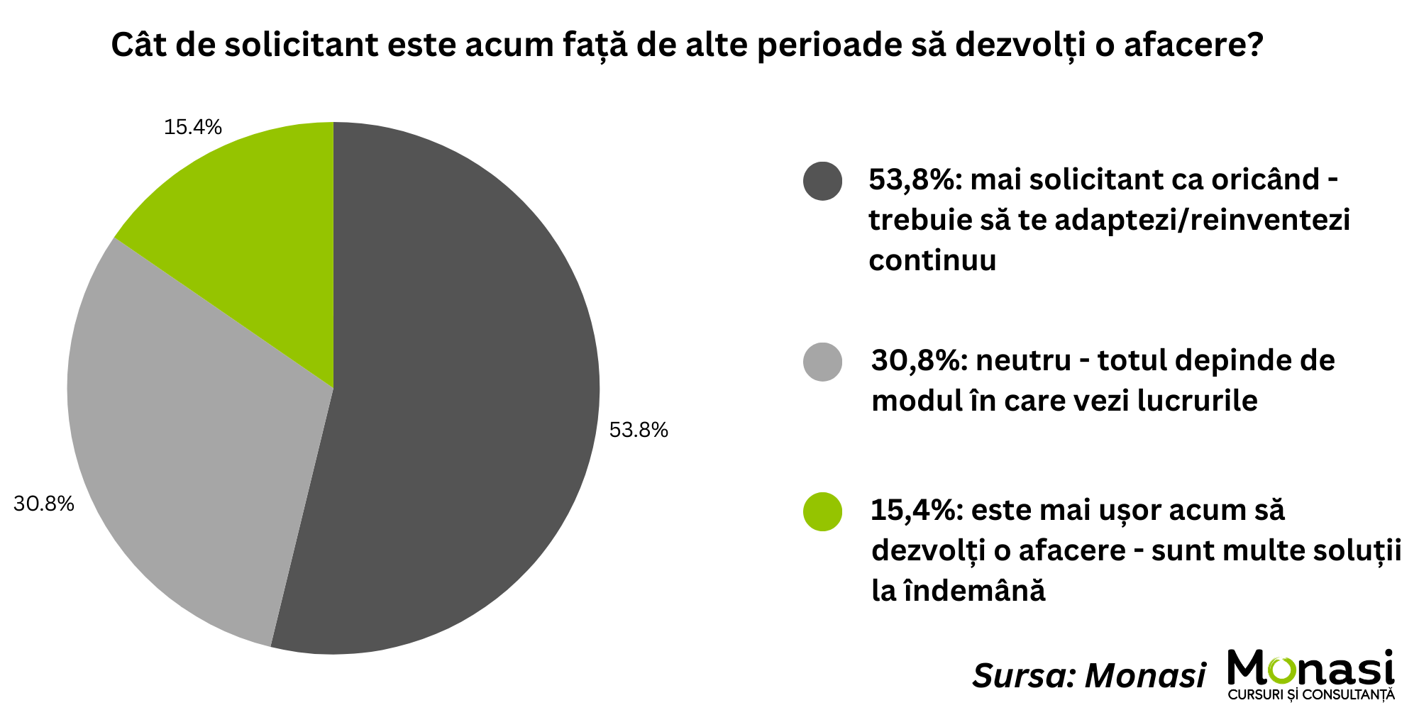Rezultatele sondajului arată că doar 15% consideră că în prezent este mai ușor decât în alte perioade să dezvolte o afacere.