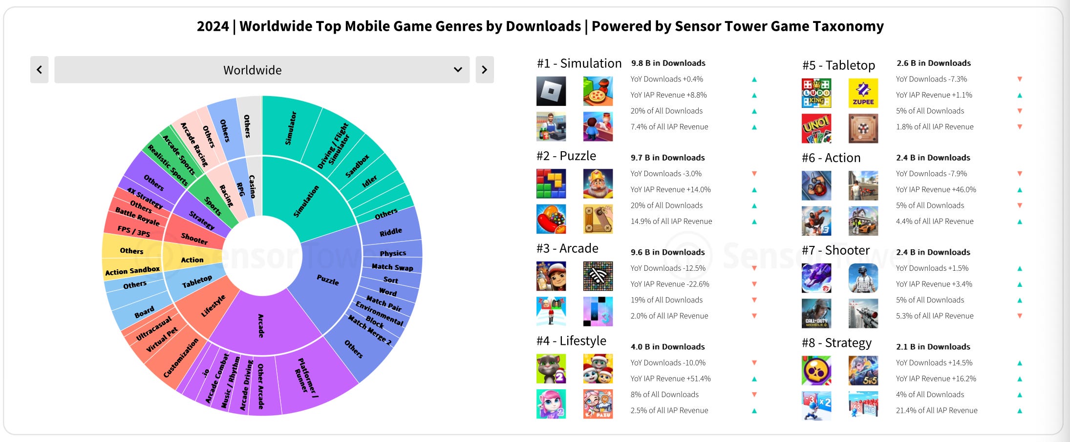 Simulatoarele (9,8 miliarde de instalări; creștere de 0,4% de la an la an), puzzle-urile (9,7 miliarde; scădere de 3% de la an la an), jocurile arcade (9,6 miliarde; scădere de 12,5%) sunt liderii pieței în ceea ce privește descărcările.