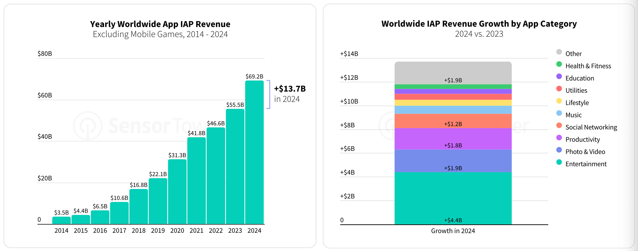 Creșterea veniturilor: În ciuda încetinirii ratelor de descărcare și a semnelor de oboseală digitală pe unele piețe, veniturile din achizițiile în aplicații și din aplicațiile plătite au crescut cu 13% de la an la an. Veniturile din aplicații ce nu sunt jocuri au crescut de la 3,5 miliarde de dolari în 2014 la 69 de miliarde de dolari în 2024, o creștere de 25% de la an la an.