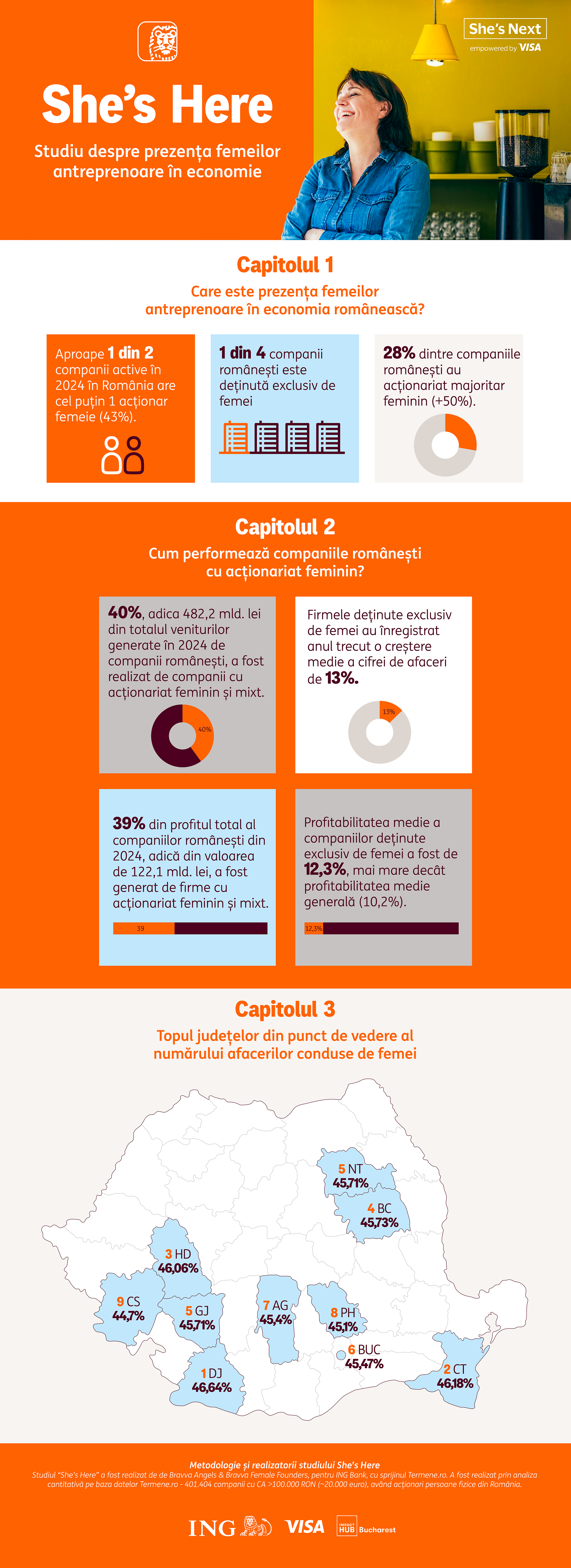 „Am demarat acest studiu pentru a marca cea de-a doua ediție a She’s Next, program dedicat femeilor antreprenoare din România, oferit de ING Bank și Visa, în colaborare cu Impact Hub Bucharest. Înscrierile în programul She’s Next au început deja și durează până pe 22 octombrie 2025. Accesul este deschis tuturor afacerilor cu peste un an de activitate și care sunt deținute în majoritate de femei (cel puțin 51%). Acestea pot câștiga granturi în valoare totală de 60.000 de euro și mentorat 1 la 1, coaching de grup, expunere și vizibilitate pentru afacerea lor, dar și acces într-o comunitate gata să le susțină cu idei și soluții.
