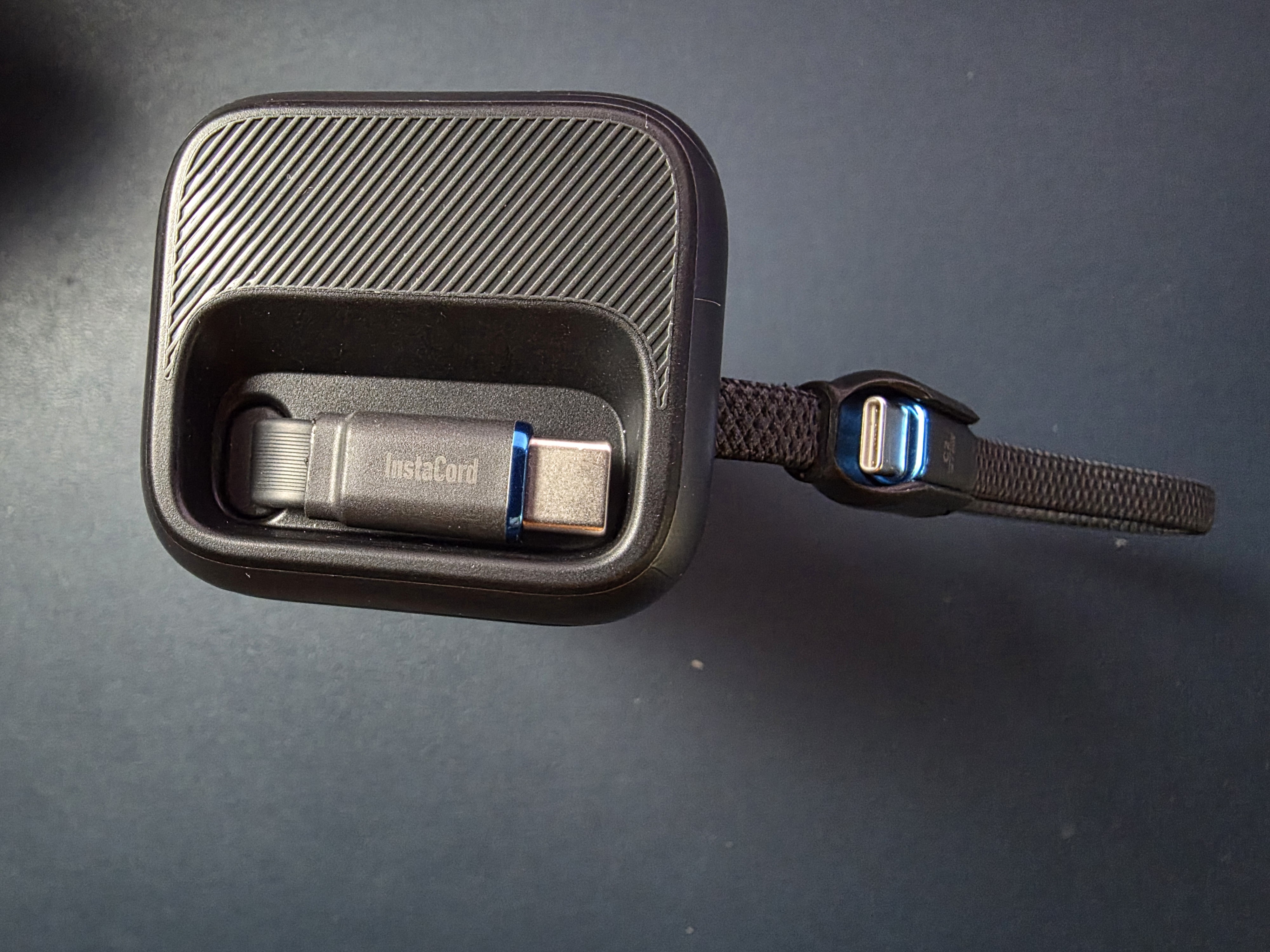 Cablurile integrate. Mi s-a întâmplat ca într-o deplasare să iau o baterie externă din birou și un cablu și să le arunc în ghiozdan. Mai aveam puțin la bateria telefonului și am zis să-l pun la încărcat. Hopa! Cablul pe care l-am luat nu dădea curent prin portul respectiv USB-C, doar putea fi încărcată bateria. Le-am cărat degeaba după mine neputând să le folosesc. Aici ai un cablu retractabil care nu se bălăngăne când nu-l folosești și un alt cablu scurt pe care-l poți folosi pe post de curea pentru transport. Foarte ingenios.