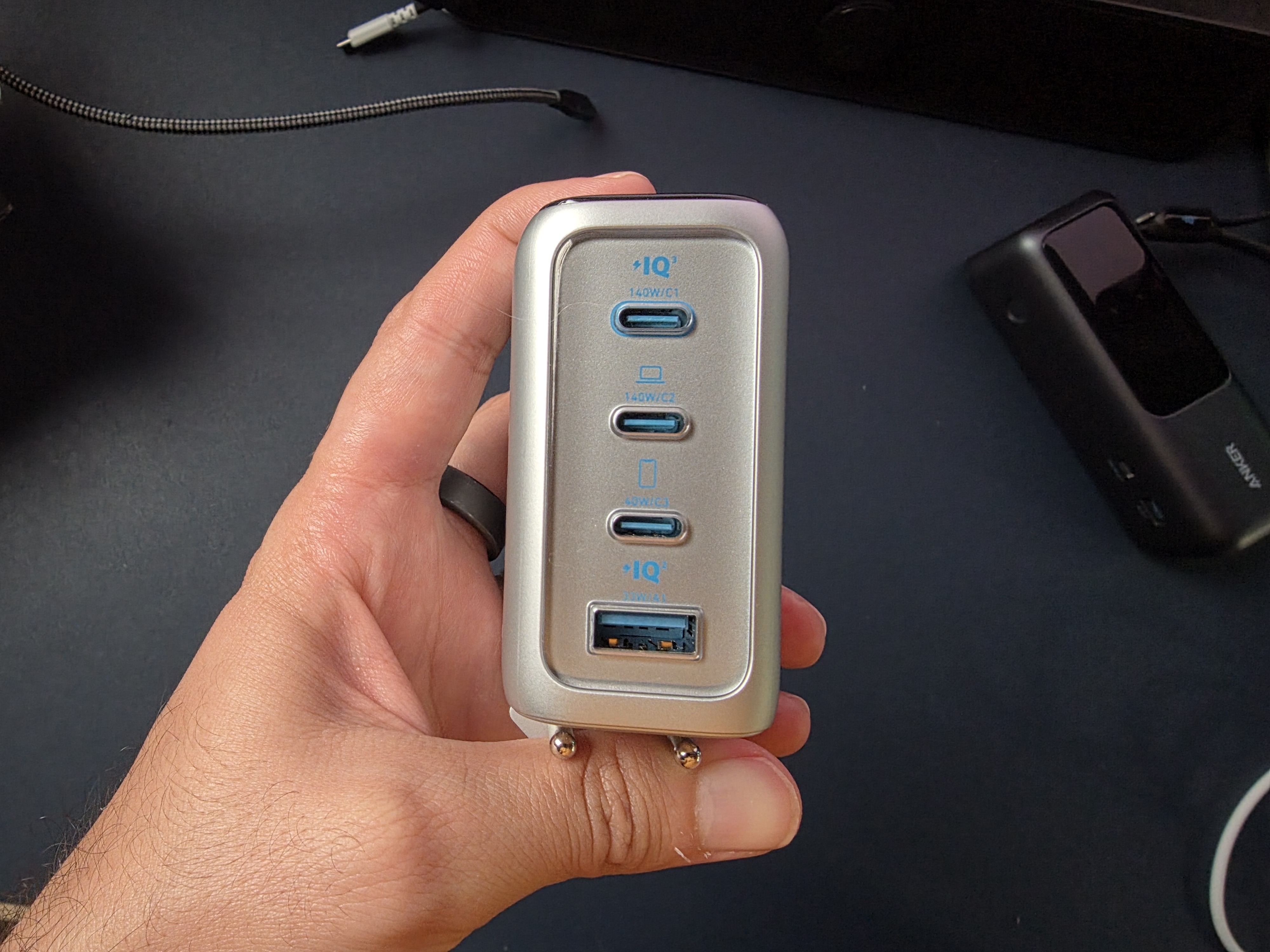 Al doilea gadget Anker pe care l-am testat este un încărcător compact de laptop cu o putere maximă de 140W și patru porturi de încărcare.