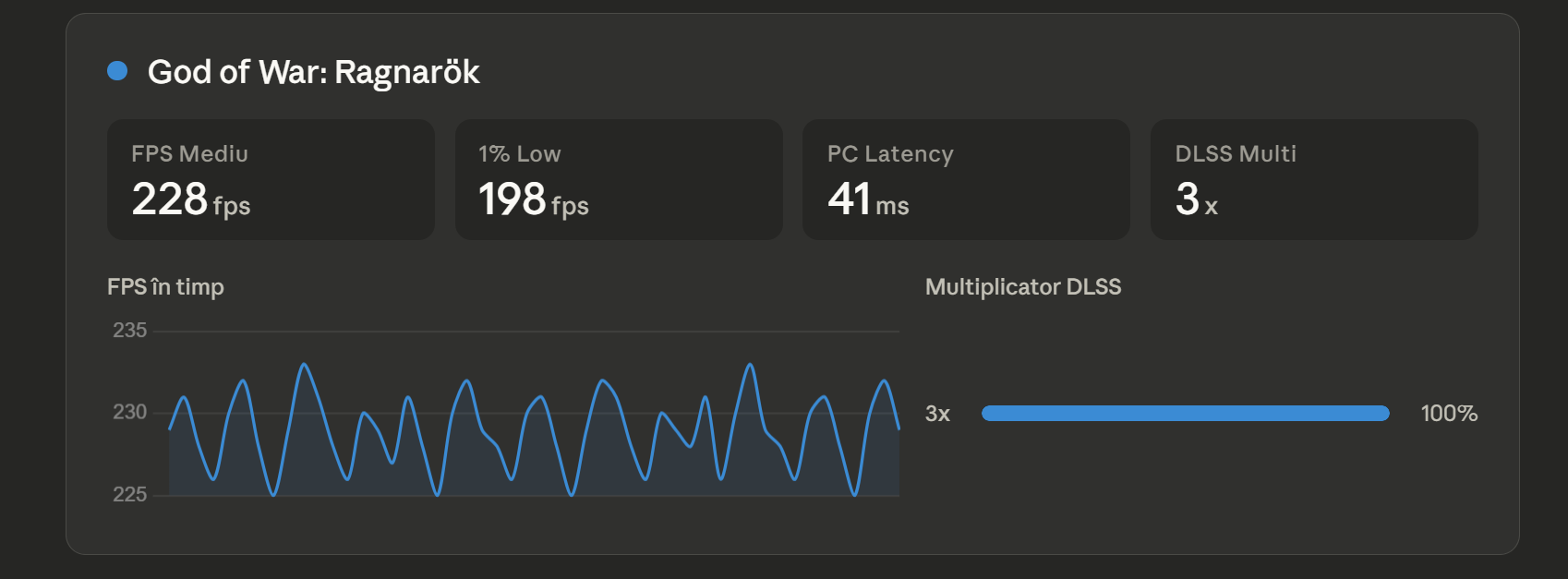 Toate trei jocurile se comportă remarcabil de similar ca FPS mediu afișat (~228–238 fps), ceea ce are sens dat fiind că toate rulează cu DLSS Multi Frame Generation activ. Dragon Age are cel mai mare mediu (238 fps), dar și cel mai slab 1% Low (~169 fps), la fel ca Cyberpunk. God of War stă cel mai bine la 1% Low (198 fps), semn de o experiență mai consistentă.