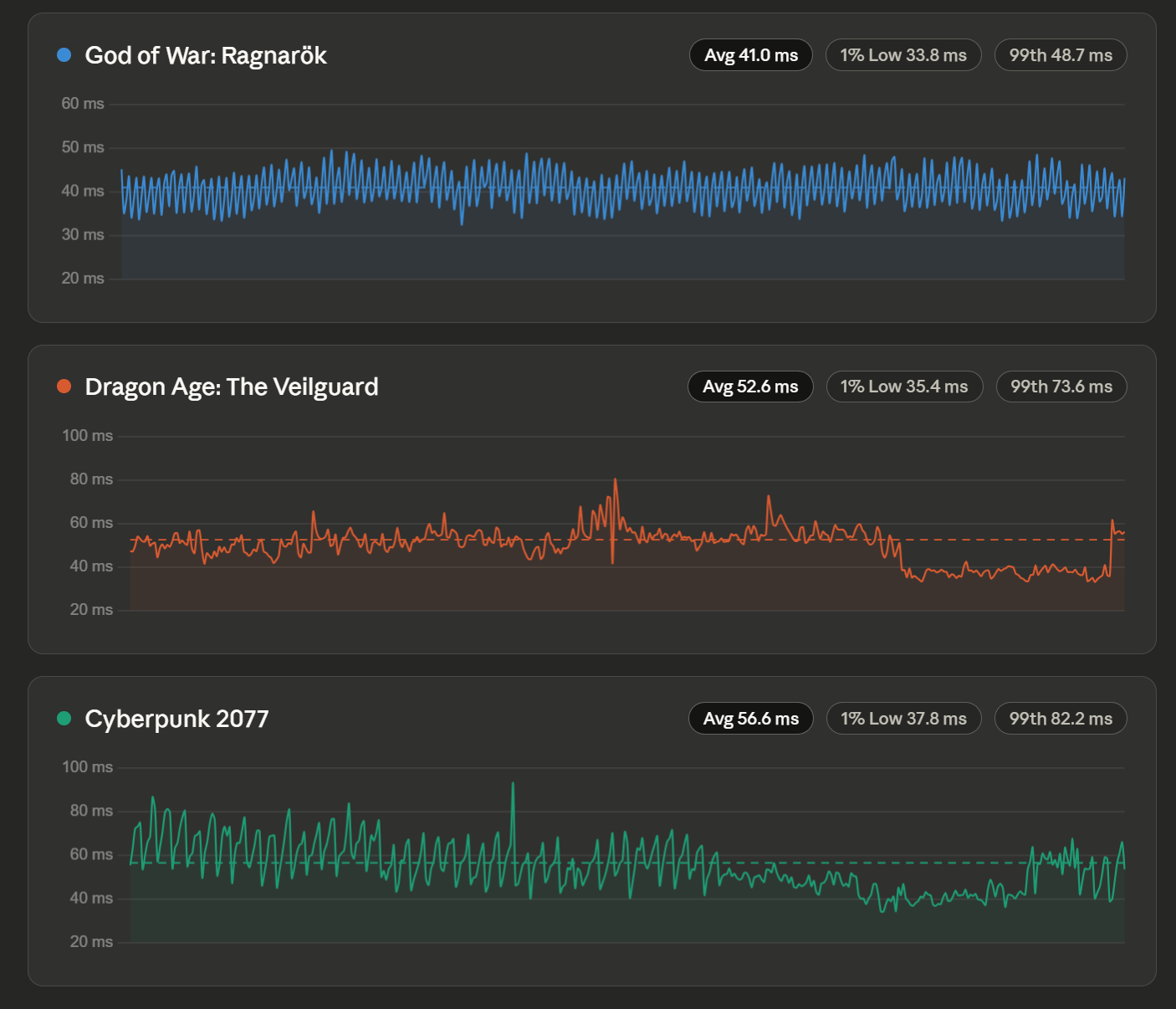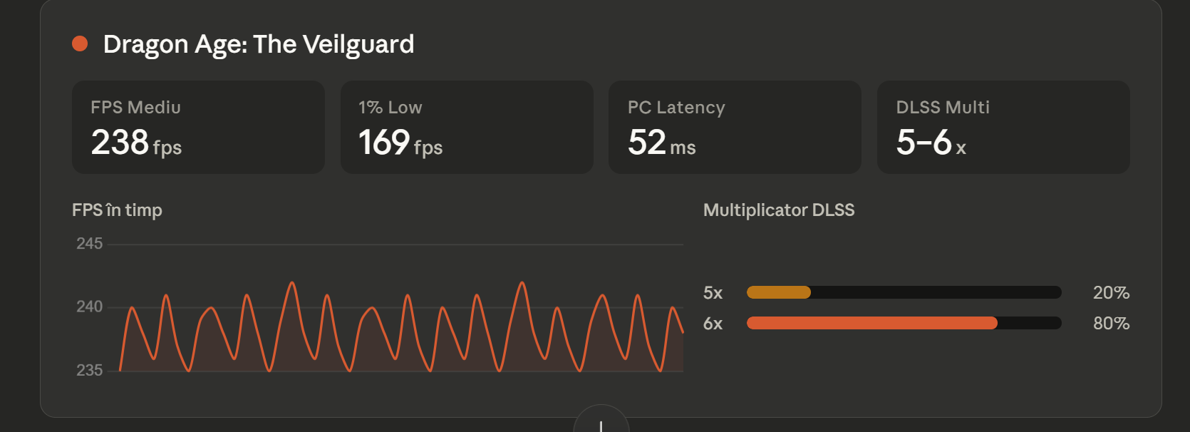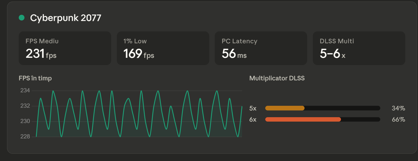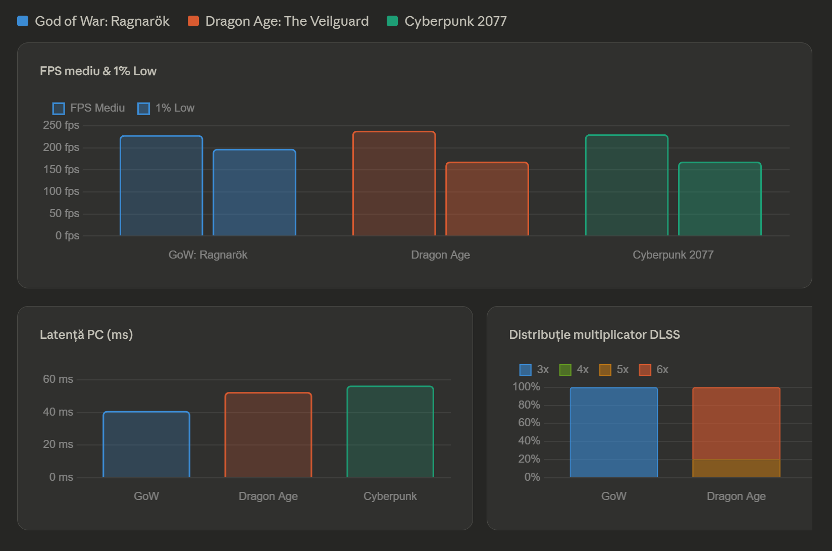 GoWR are cea mai mică latență (41 ms), Dragon Age e la mijloc (52 ms), iar Cyberpunk are cea mai mare (56 ms). Asta se corelează direct cu multiplicatorul DLSS — cu cât mai multe frame-uri generate, cu atât mai multă latență adăugată.