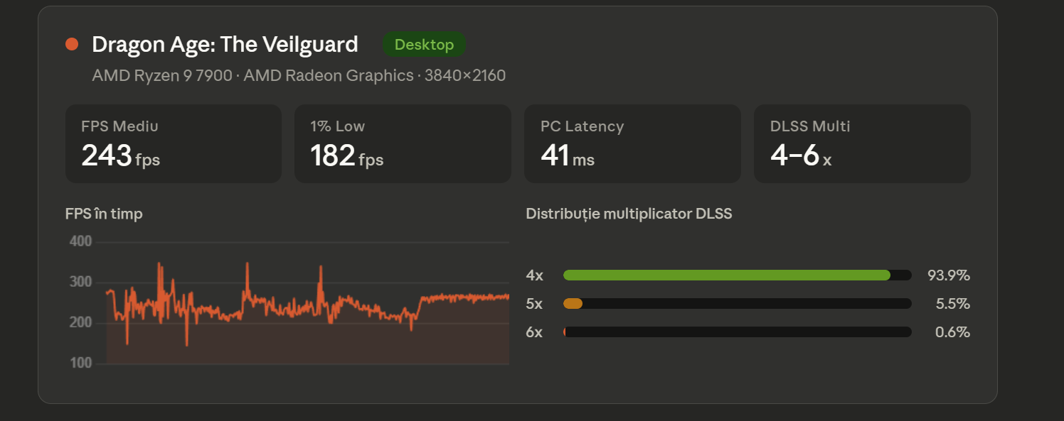Desktop-ul are un avantaj pe partea de latență: 41 ms față de 52 ms pe laptop. Asta are o corelație directă cu multiplicatorul DLSS. Desktop-ul rulează aproape exclusiv la 4x (93.9%), pe când laptop-ul rulează majoritar la 6x (79.6%). Cu cât multiplicatorul este mai mare, cu atât mai multă latență se adaugă în pipeline.