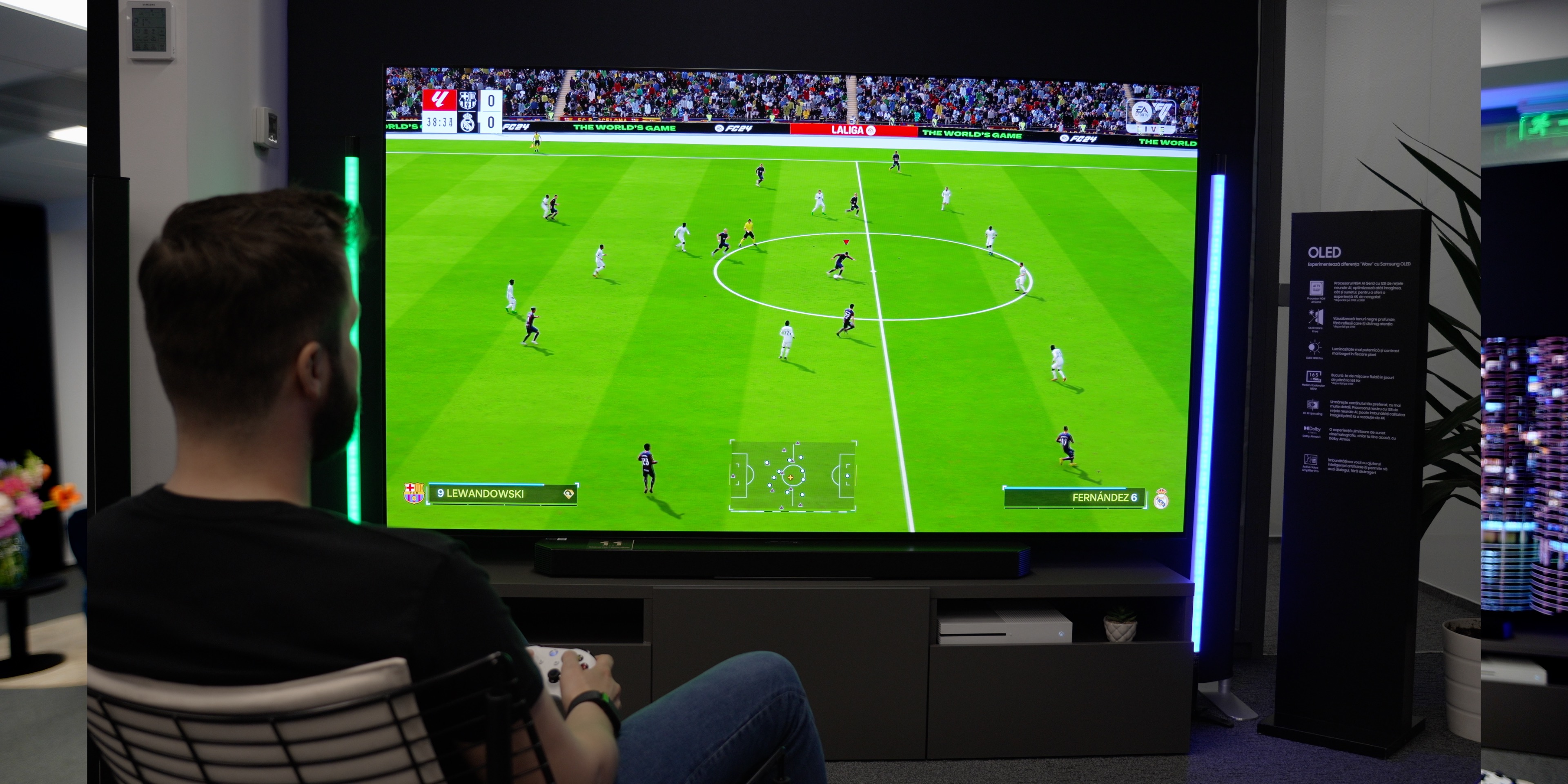 Samsung mizează mai mult pe OLED anul acesta și aduce mai multe modele la mai multe diagonele, inclusiv și de 42 de inci, apoi alte modele mai mari. OLEDul Samsung este unul foarte bun din ce am văzut în imaginile demo, dar și într-un joc scurt de FIFA, pardon EA FC. Imaginea are un contrastat mare, culori aprinse și acțiunea e smooth. Acesta are o rezoluție maximă 4K și vine cu un procesor NQ4 AI Gen 3 care poate optimiza imaginea sunetul și așa mai departe. Și aici avem un ecran mat, iar pe OLED cred că ajută mai mult deoarece în mod tradițional televizoarele OLED nu sunt la fel de luminoase ca cele MiniLED, de exemplu, pentru a combate distragerile. Acesta are o rată de refresh de până la 165 Hz, OLED HDR PRO pentru procesare, optimizări de sunet și Dolby Atmos, dar în continuare fără Dolby Vision.