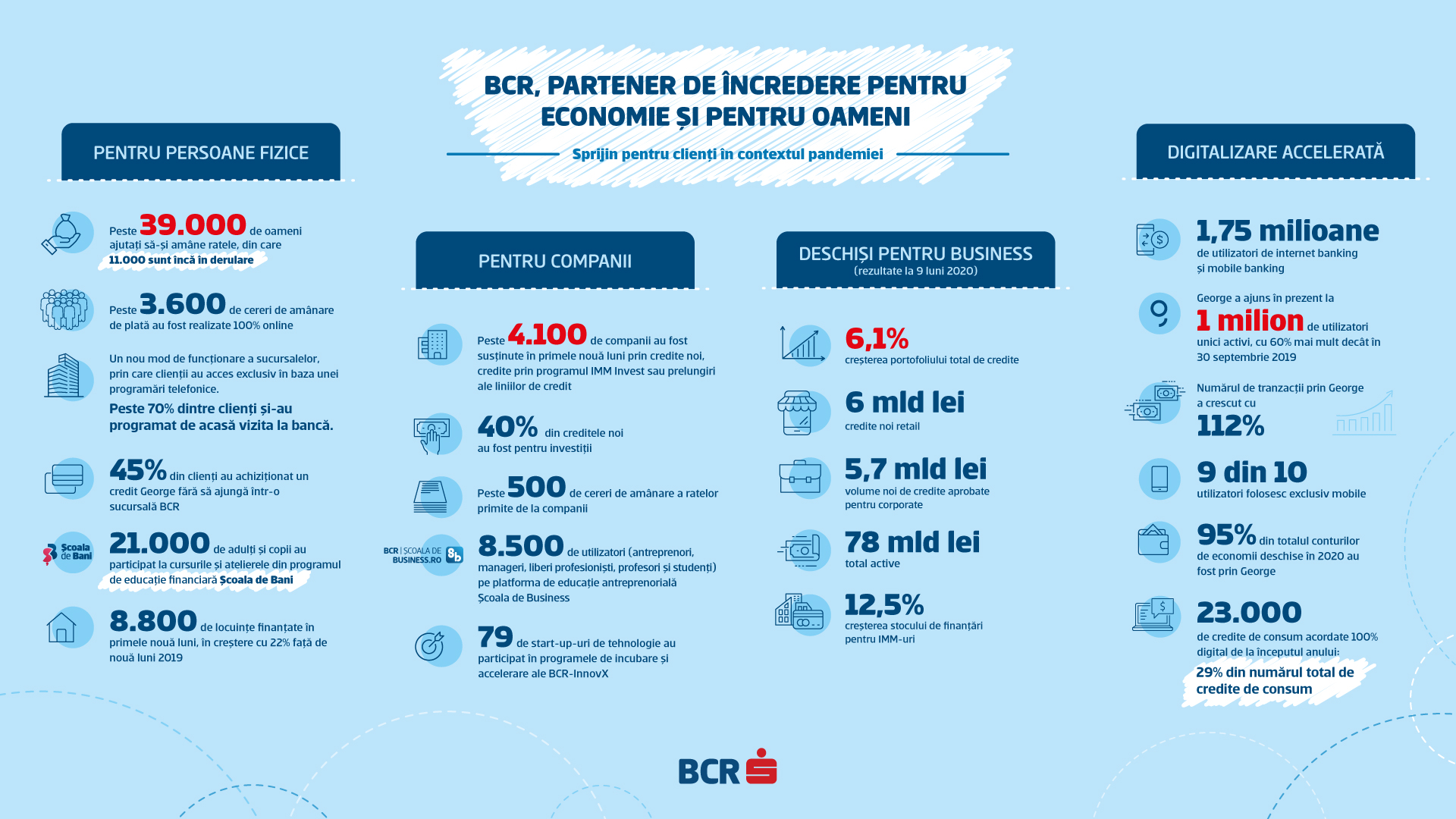 Platforma de educație antreprenorială Școala de Business a ajuns la 8.500 de utilizatori (antreprenori, manageri, liberi profesioniști, profesori și studenți). Mai mult, echipa BCR a realizat sesiuni online cu peste 1.000 de antreprenori în care echipa BCR a discutat despre indicatorii de încredere pe care o bancă îi urmărește atunci când creditează.