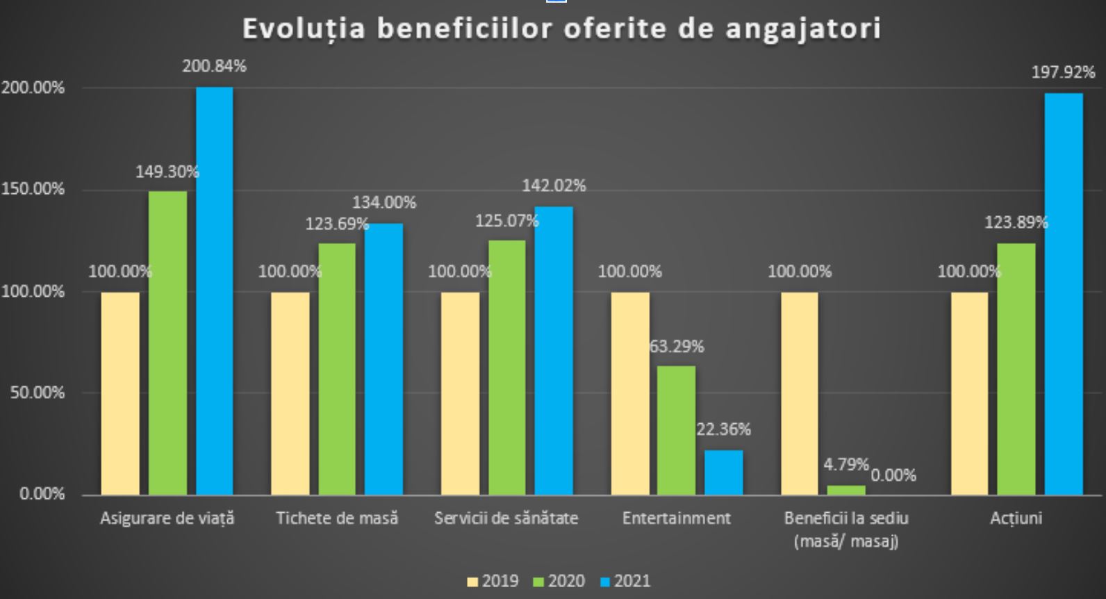 - Diminuarea anumitor pachete de avantaje în natură, precum abonamentele la sală și petrecerile de Crăciun. Putem considera că pandemia de COVID-19 și închiderea sălilor de fitness în anumite perioade, a avut un impact și în sfera activităților sportive și recreative. Anul 2021 a înregistrat o scădere cu încă 40% față de valorile înregistrate în anul 2020.