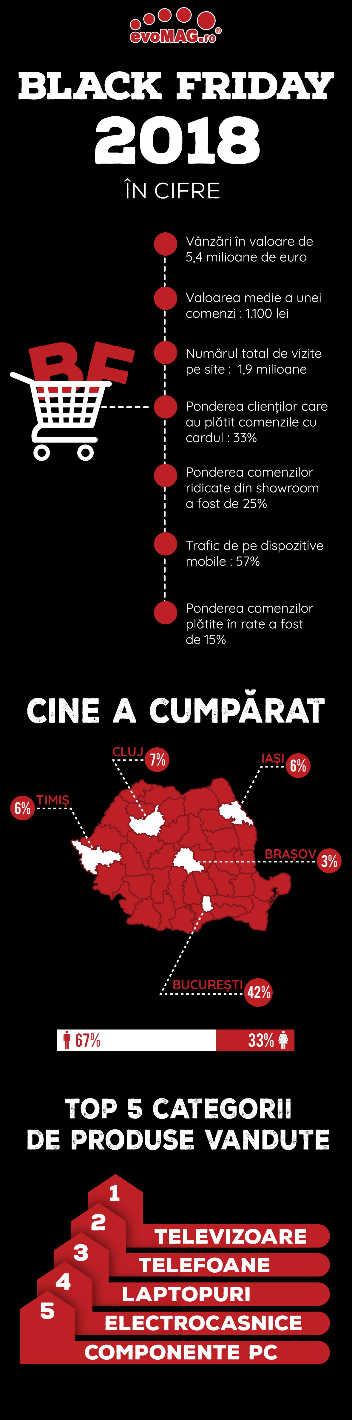 Pe parcursul desfășurării perioadei de Black Friday 2018, din totalul comenzilor, aproximativ 6.000 de comenzi au fost ridicate din showroom, adică 25% din numărul total de comenzi plasate pe evoMAG.ro, în perioada 1 – 25 noiembrie 2018.