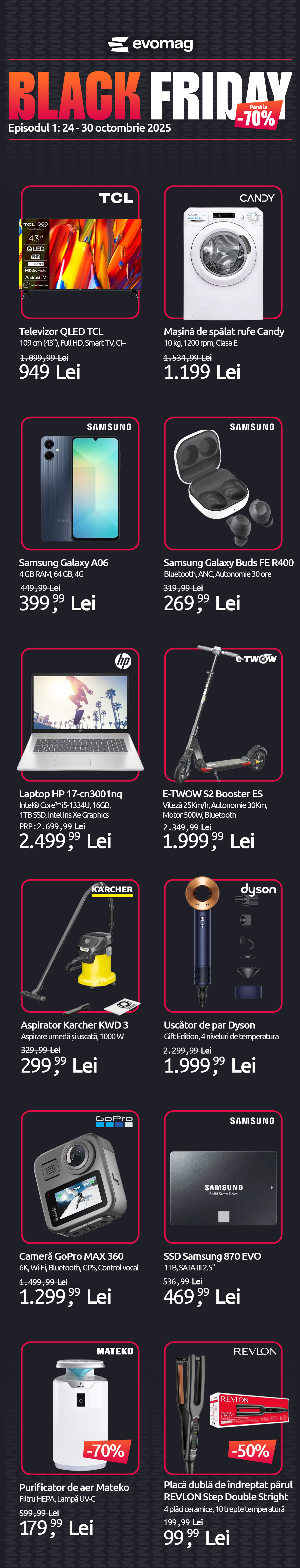 evomag desfășoară campania de Black Friday 2025 în perioada 24 octombrie – 9 noiembrie, în 3 etape distincte (24 - 30 octombrie, 31 octombrie – 6 noiembrie și 7 – 9 noiembrie) și oferă reduceri de până la 70% la zeci de mii de produse din toate categoriile: televizoare, electrocasnice mari și mici, telefoane, laptopuri, gadgeturi smat, produse de gaming, trotinete electrice.