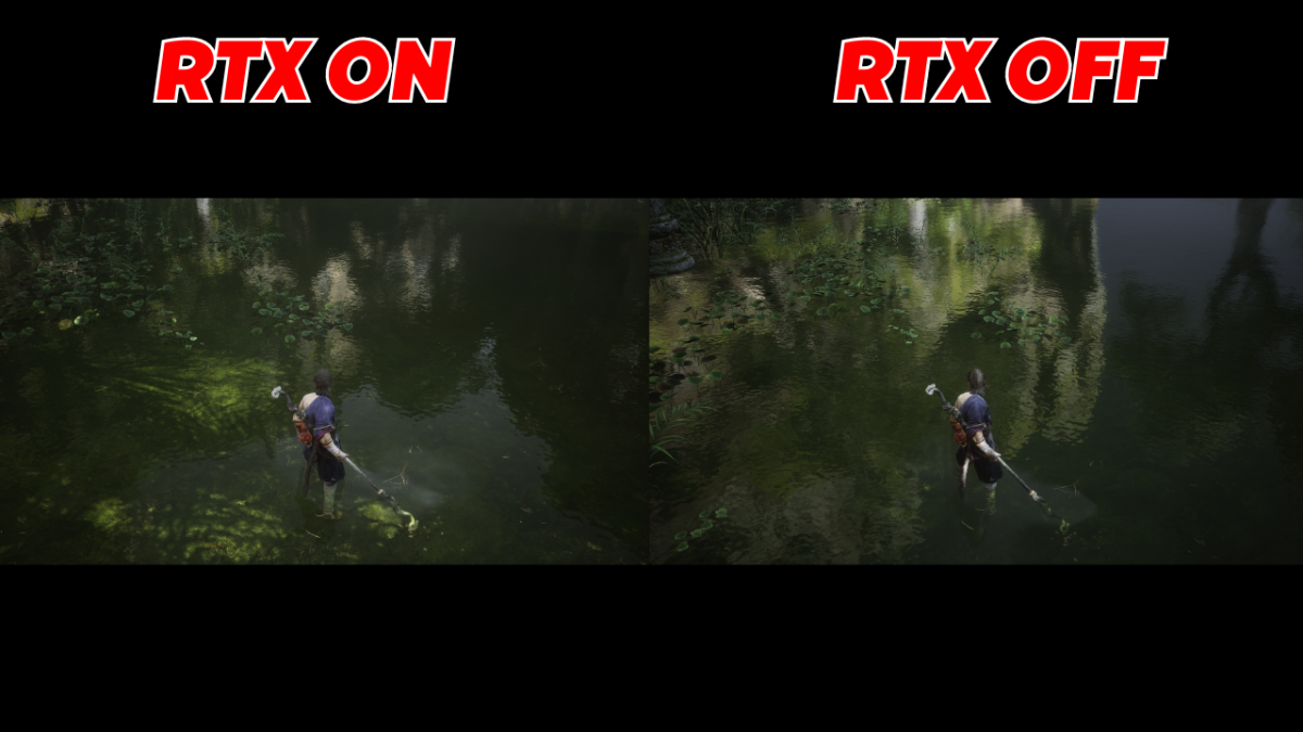 Unde diferența este mai evidentă este la capitolul reflexii și ray tracingul este evident mai bun cu reflexii mai bune, mai naturale, mai detaliate și care creează un efect mult mai natural. Cu Full RT activat vezi mult mai bine mediul înconjurător care se reflectă în apă. Elementele dinamice precum inamicii sunt mult mai bine reprezentați în reflexii cu full ray tracing activat. Însă mai important, din punct de vedere vizual, e modul în care lumina se reflectă pe fundul apei cu ray tracing activat și putem vedea chiar cum lumina se reflectă asupra personajului când merge prin apă, ceea ce nu se întâmplă când funcția este dezactivată.