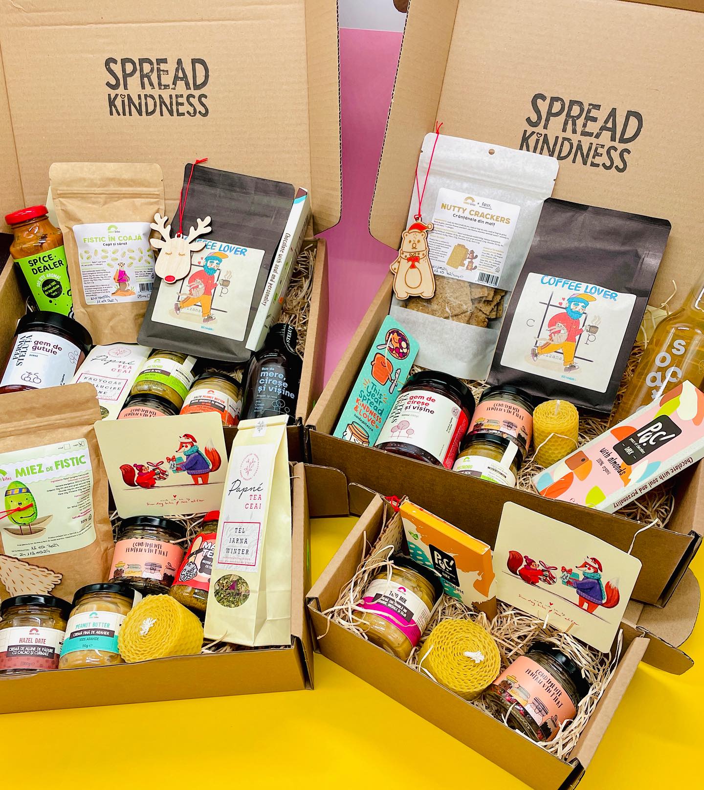 Pe lângă produsele proprii, de Crăciun Sunday Bites a pregătit niște cutii cadou, ce conțin numai produse de la branduri românești, de la cremele lor, până la lumânări, felicitări și decorațiuni tematice.