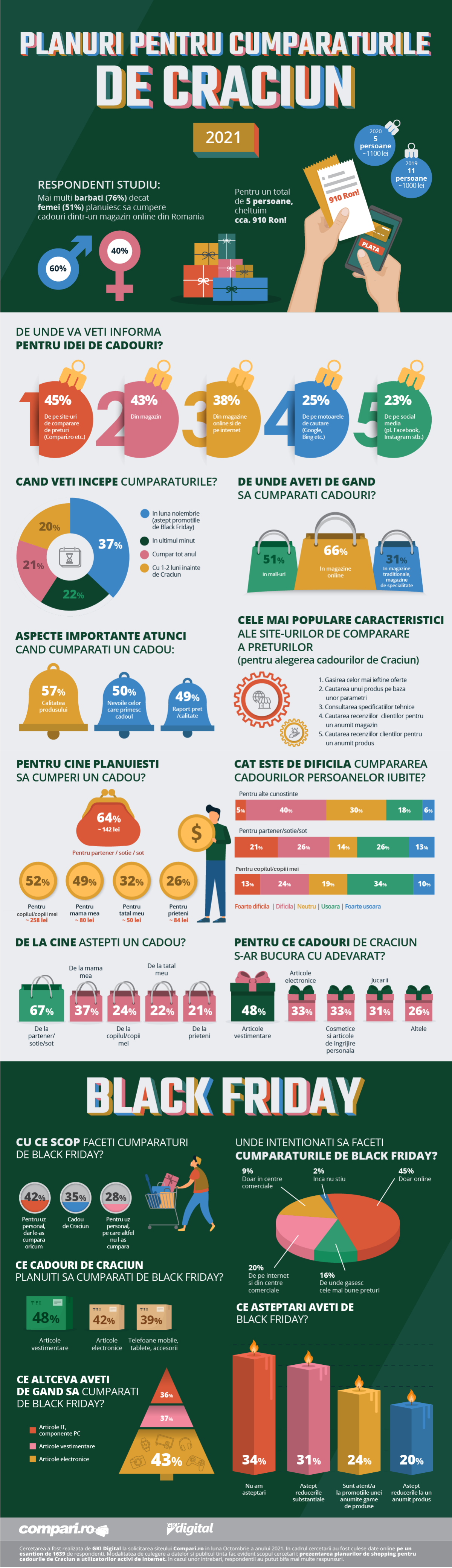 Potrivit studiului realizat de Compari.ro pe un eșantion de 1.627 de persoane, utilizatorii de internet din România vor cheltui în medie 910 lei pentru cadourile de Crăciun din acest an, ceea ce reprezintă o scădere de aproximativ 17% față de 2020.