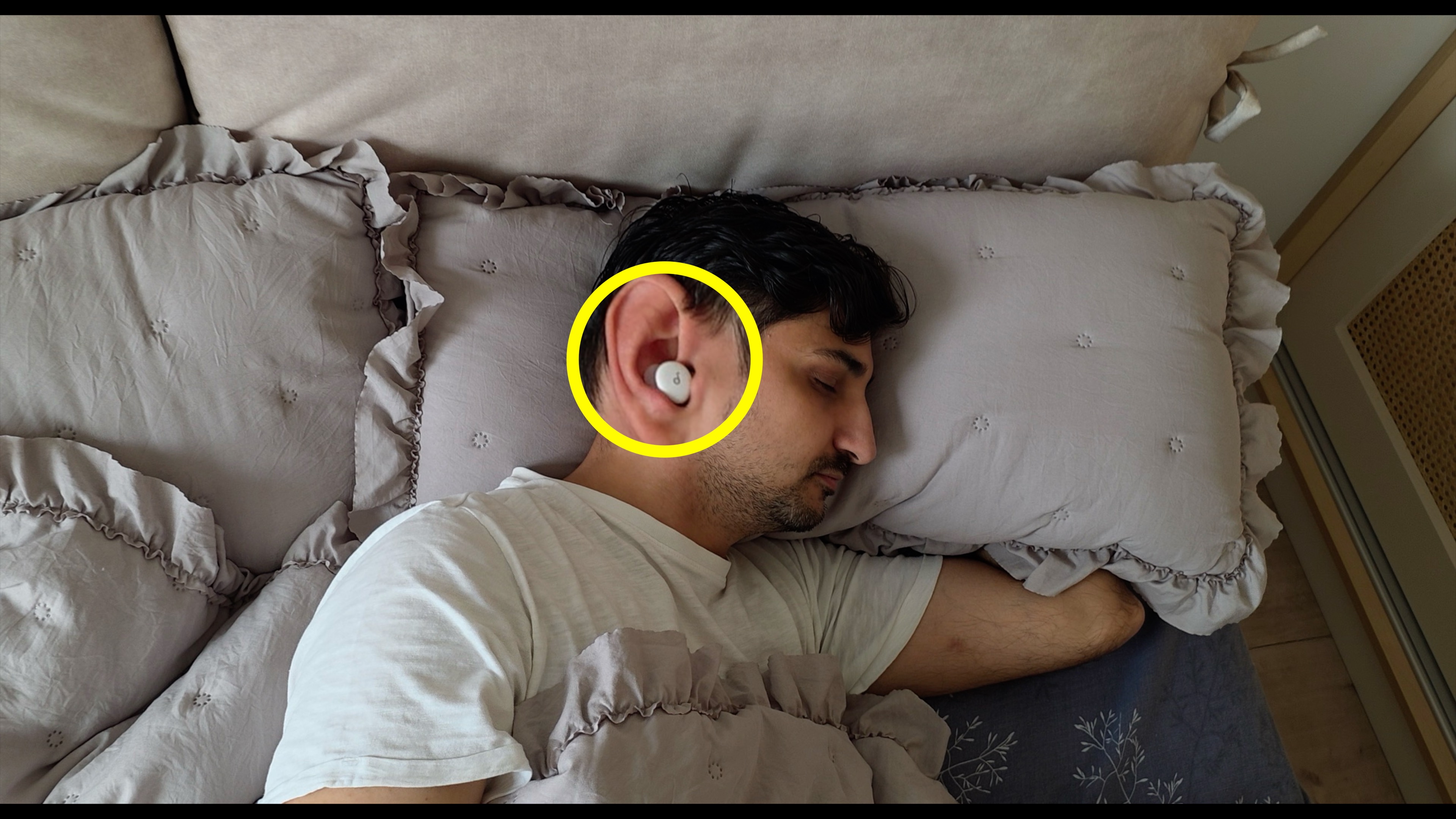 Și acum atenție la partea cool: căștile detectează automat când adormi și opresc sunetul. Deci nu-ți consumă bateria toată noaptea. Când te trezești în miezul nopții, poți reporni sunetul cu un dublu tap pe casca stângă.