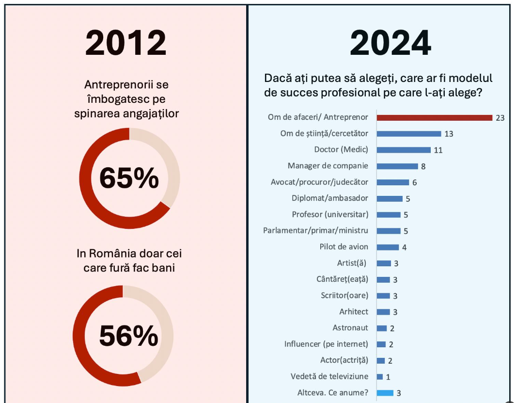 În anii 2010, aceștia erau percepuți ca niște exploatatori - care se îmbogățesc pe spinarea angajaților. Ei bine, măsurătorile din 2024 realizate prin platforma Frappe Digital arată un peisaj foarte diferit. Astfel, datele arată că antreprenorii au devenit o categorie nu doar dezirabilă, dar și aspirațională. De exemplu, întrebați care este modelul profesional de succes pe care l-ar alege dacă ar putea, aproape un sfert dintre cei chestionați (18-65 ani, mediul urban) și-ar dori să fie antreprenori. Într-un alt studiu marca Frappe Digital, întrebați despre dezirabilitatea diverselor categorii sociale ca vecini, oamenii au preferat să fie vecini cu antreprenori, peste alte categorii cum ar fi preoții sau personalitățile publice.