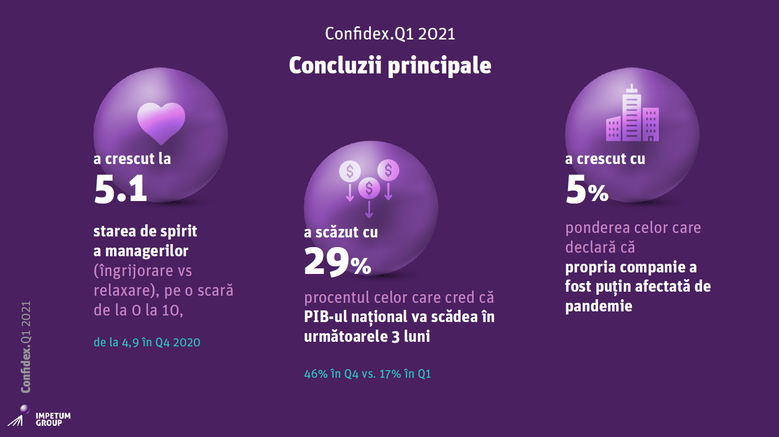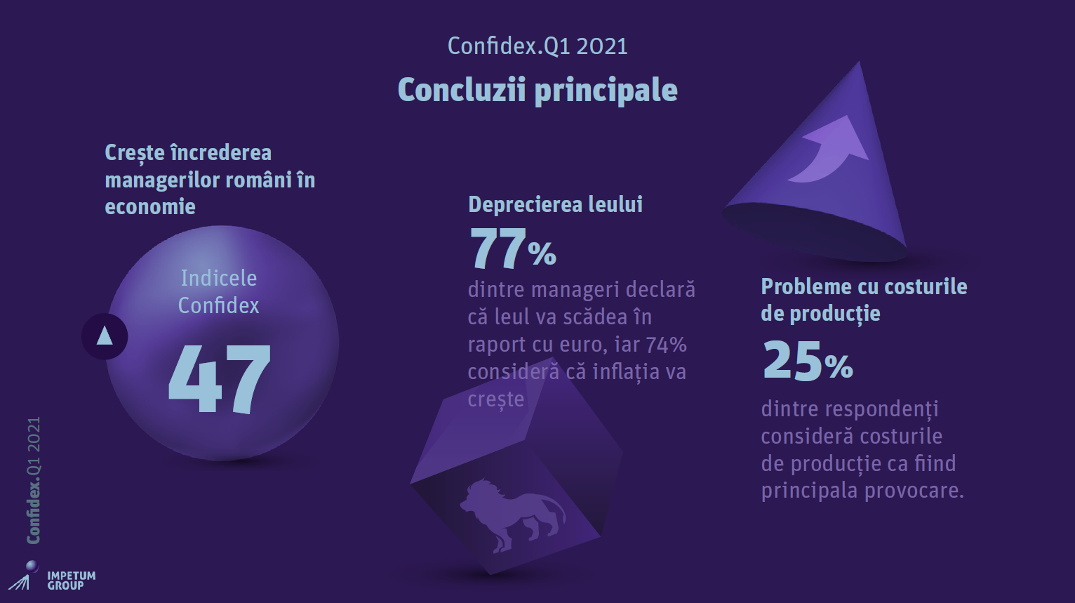 ,,CONFIDEX Q1 2021 ne arată o creștere a încrederii și a stării de spirit în rândul managerilor. Analiza principalilor indicatori economici ai companiilor ne arată de asemenea o evoluție pozitivă. Cu toate acestea, deși managerii prevăd o îmbunătățire a PIB și a șomajului, în 2021 am remarcat și predicția unui an cu o inflație mai ridicată, pe fondul creșterii prețurilor la anumite materii prime.”, declară Andrei Cionca, CEO & Co-founder Impetum Group.