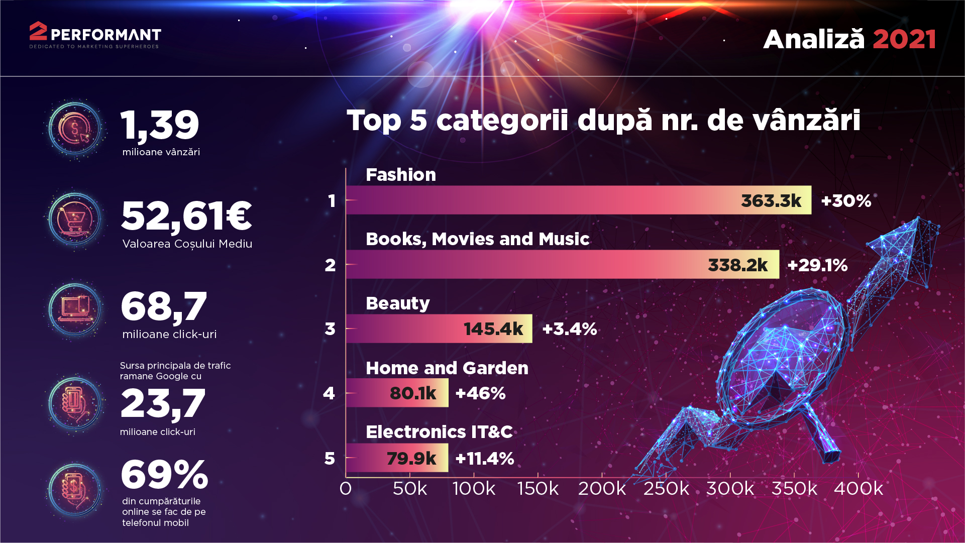 În 2021, platforma tehnologică 2Performant.com, dezvoltată in house, prin care profesioniști în marketingul digital colaborează cu magazinele online, a intermediat 68,7 milioane de click-uri, cu 23,4% mai mult decât în anul precedent.
