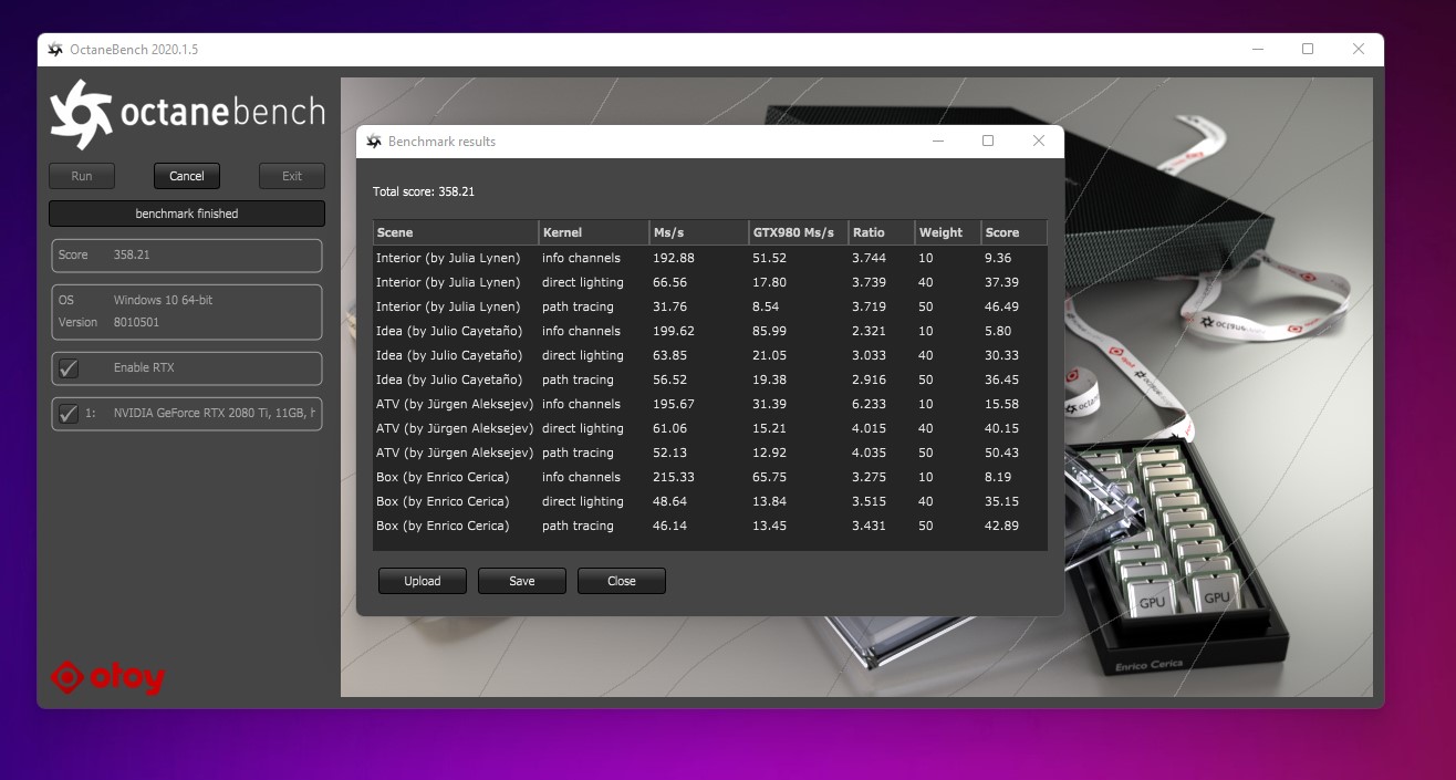 Apoi am trecut la Octane Benchmark. Cu acest program se randează diferite proiecte grafice și la final primești o notă pentru fiecare proiect. După cum se poate vedea în imagini, randările realizate cu driverul Studio au primit note mai bune în toate situațiile. În unele cazuri diferența a fost mai mare, în altele mai mică. În total, plusul de performanță adus de driverele Studio a fost de 2,2%.