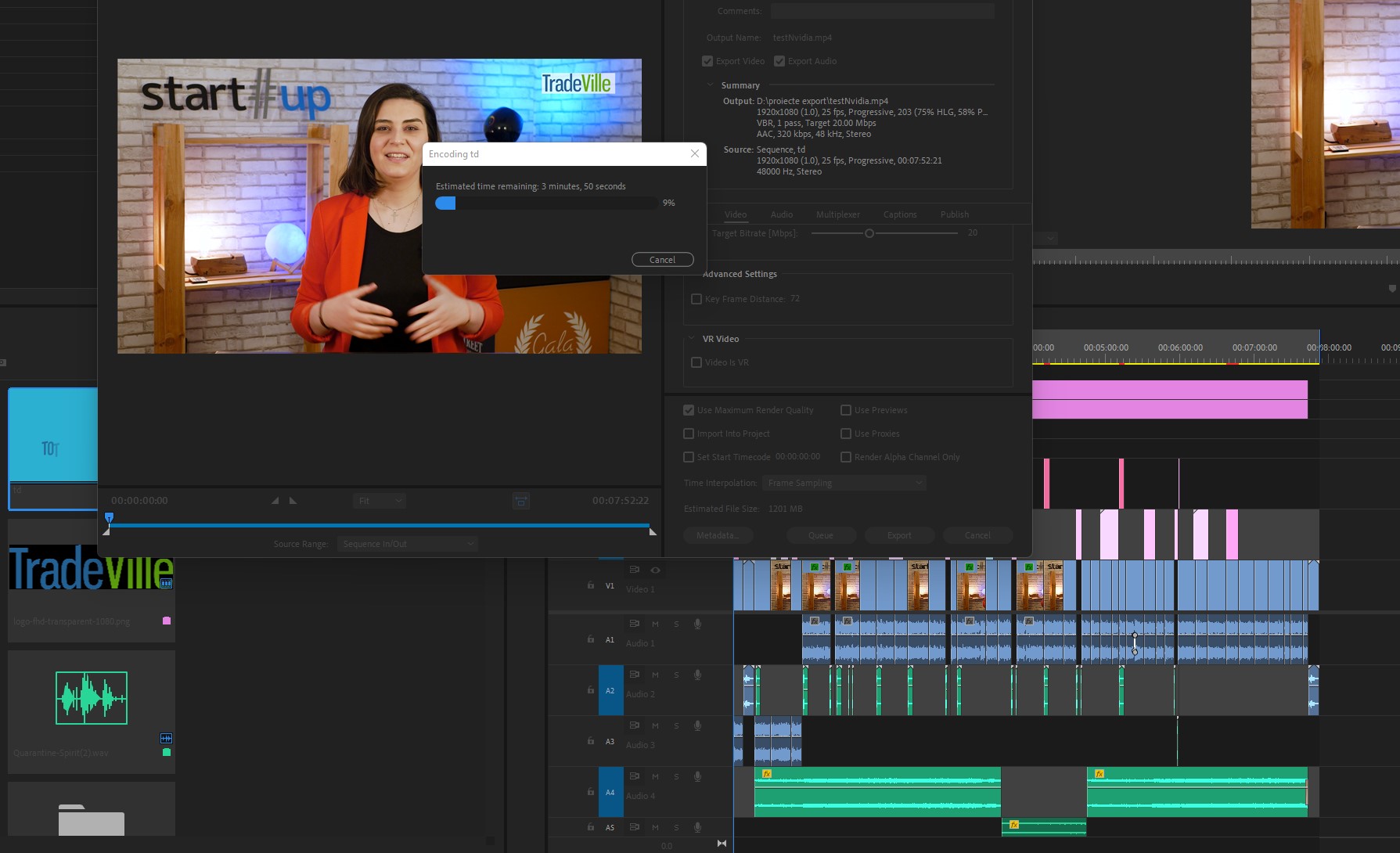 Noi la start-up.ro și în cadrul VideoCorp lucrăm foarte mult cu video și este foarte important ca toate producțiile video pe care le facem să fie editate rapid, eficient și primul lucru pe care l-am făcut a fost să editez și să dau export la un proiect video de 8 minute compus din clipuri 4K, 1080p, ce conține elementele grafice, imagini, coloană sonoră și efecte sonore în format FHD. Cu driverele Game Ready, acest proiect a fost exportat în 2 minute și 54 de secunde. Cu driverul Studio acest timp a fost scurtat la 2 minute și 45 de secunde. Poate părea puțin, însă gândește-te că acestea sunt secunde câștigate, nu pierdute și la un proiect mai mare și mai complex poți câștiga și mai mult timp. Iar în unele cazuri o întârziere a unui proiect poate costa o companie sute sau mii de dolari.