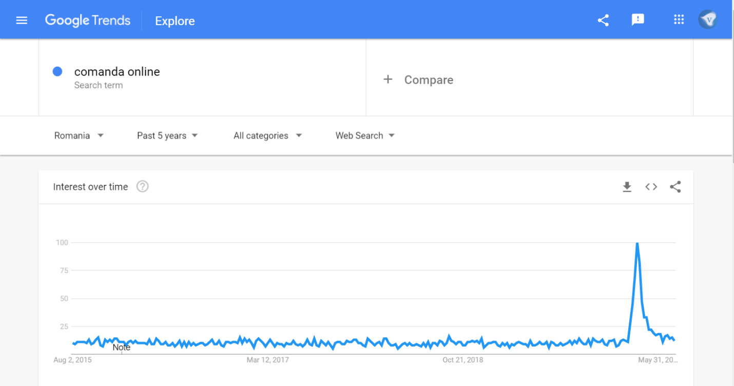 Un vârf similar al interesului a fost remarcat și în cazul căutărilor pentru „comandă online”. Pentru ultimii cinci ani, în 2020 a fost atins un nivel record. Și se menține la un nivel mai ridicat decât înainte de luna martie.