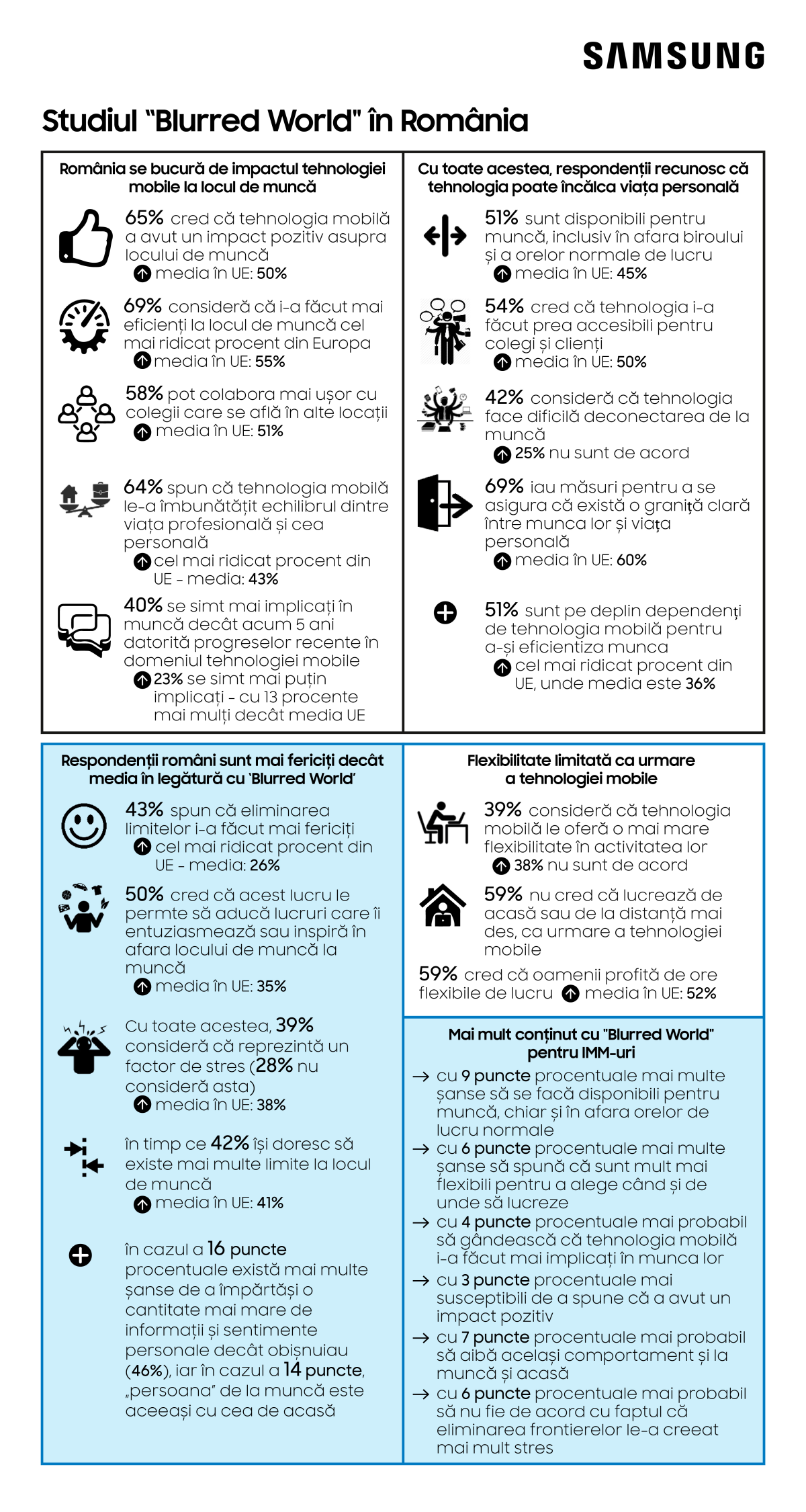 Conform unui studiu realizat de Samsung Electronics în colaborare cu Vitreous World, românii se bucură de impactul tehnologiei la locul de muncă și îmbrățișează cu ușurință inovațiile propuse în rândul dispozitivelor mobile - 65% sunt de părere că tehnologia mobilă a avut un impact pozitiv asupra locului de muncă, pe când media în UE este un pic mai mică și anume 50%.