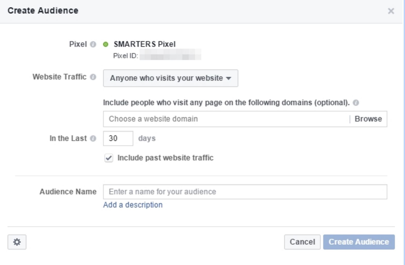 Tot ce trebuie să facem este să instalăm Facebook Pixel în secțiunea <Head> a site-ului nostru și să creăm o audiență cu vizitatorii site-ului. Mai multe detalii despre instalarea Facebook Pixel aici.