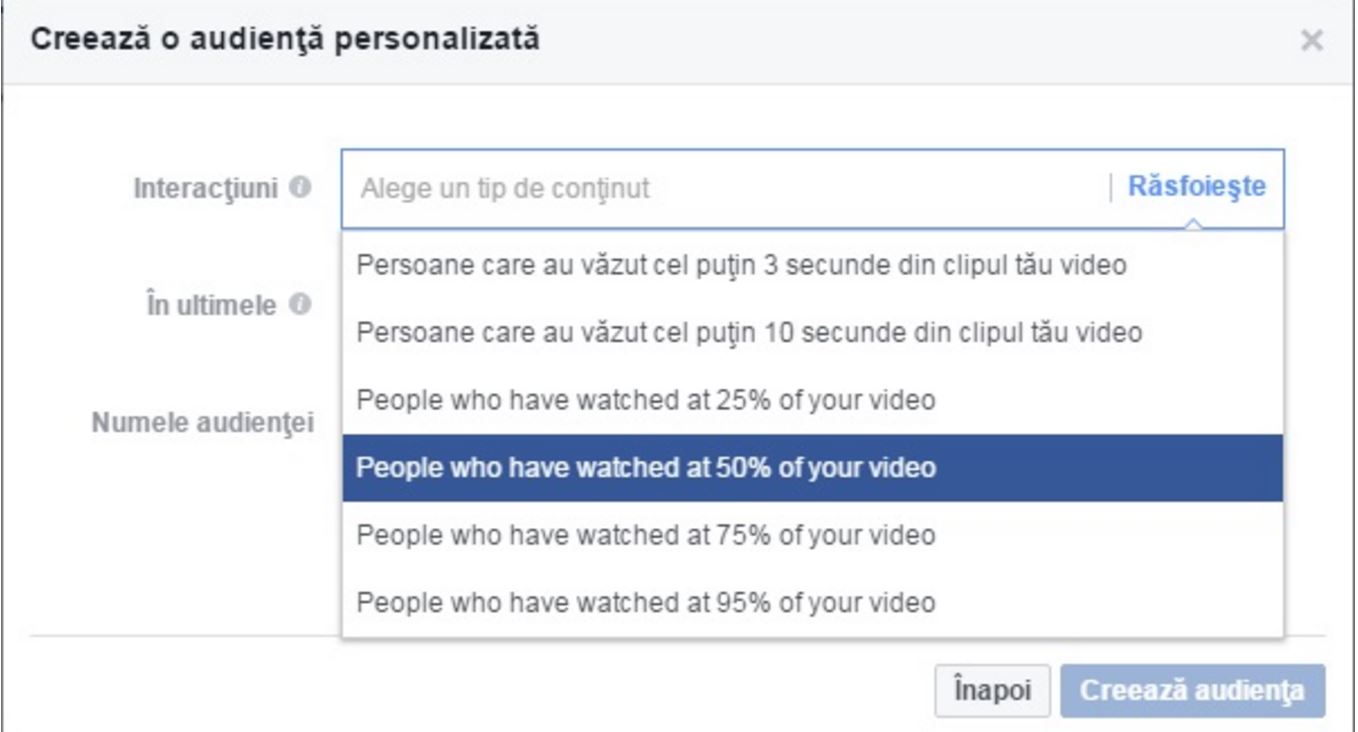 Cum putem folosi asta? De exemplu, putem crea un video de calitate, care este una din cele mai eficiente metode de promovare pe Facebook la ora actuală, și apoi putem crea o reclamă pentru persoanele care au văzut tot videoul, deci sunt interesaţi de ceea ce vorbeam în el. Acum îi trimitem spre un landing page unde pot afla mai multe despre produsul/serviciul nostru și să-l cumpere sau să ceară o ofertă. Joacă-te cu opţiunile în funcţie de ceeea ce se pitoreşte afacerii tale.