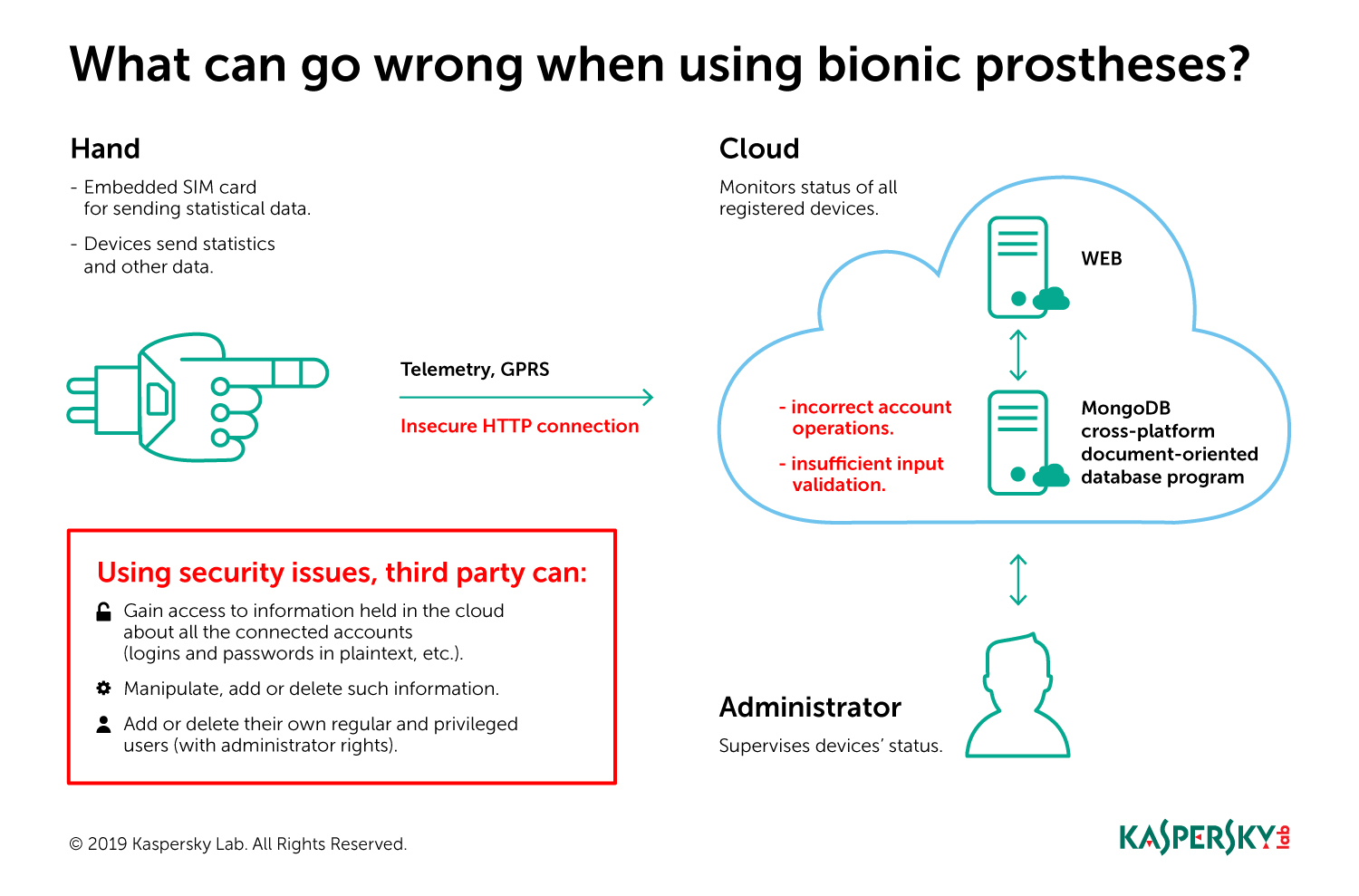 Cercetarea inițială a identificat câteva probleme de securitate. Acestea includ: conexiunea http, operațiuni de cont incorecte și validarea insuficientă a input-urilor. Atunci când este folosită, proteza de mână transmite date către sistemul cloud. Din cauza vulnerabilităților de securitate, un atacator ar fi putut: