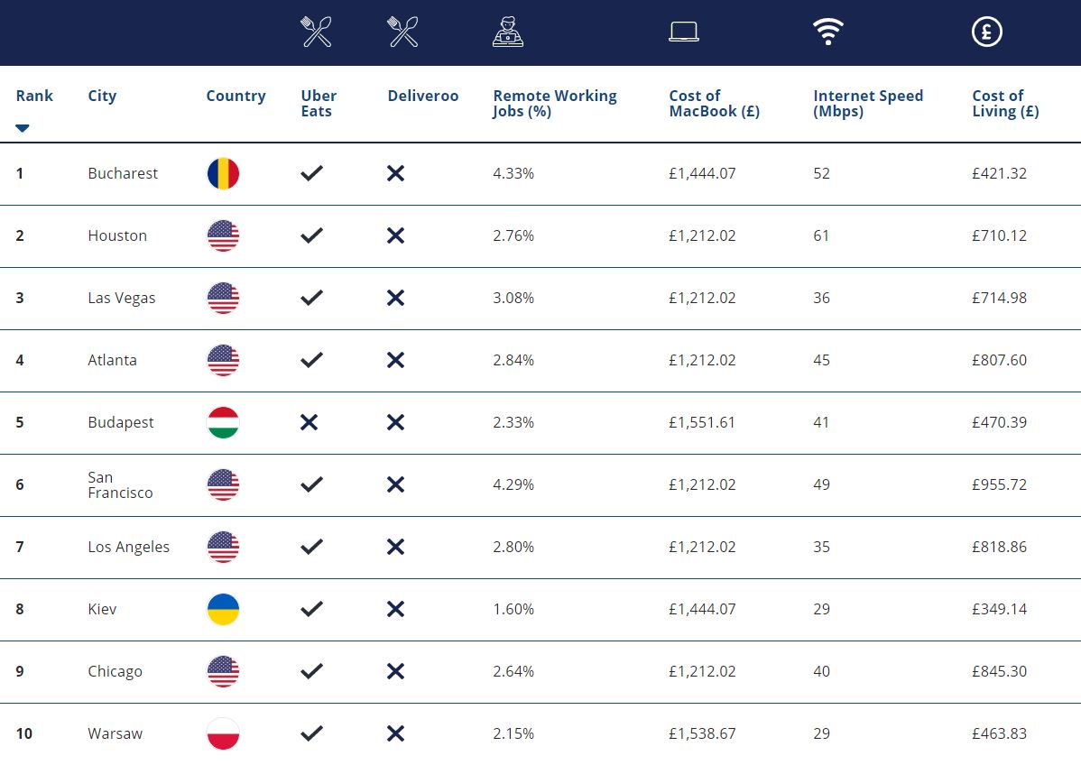Studiul a luat în considerare 50 de orașe mari din lume și le-a clasificat în funcție de cinci factori: viteza medie a conexiunilor la internet, disponibilitatea serviciilor de food delivery, numărul joburilor disponibile în format work from home, prețul unui laptop și ”costul vieții”.
