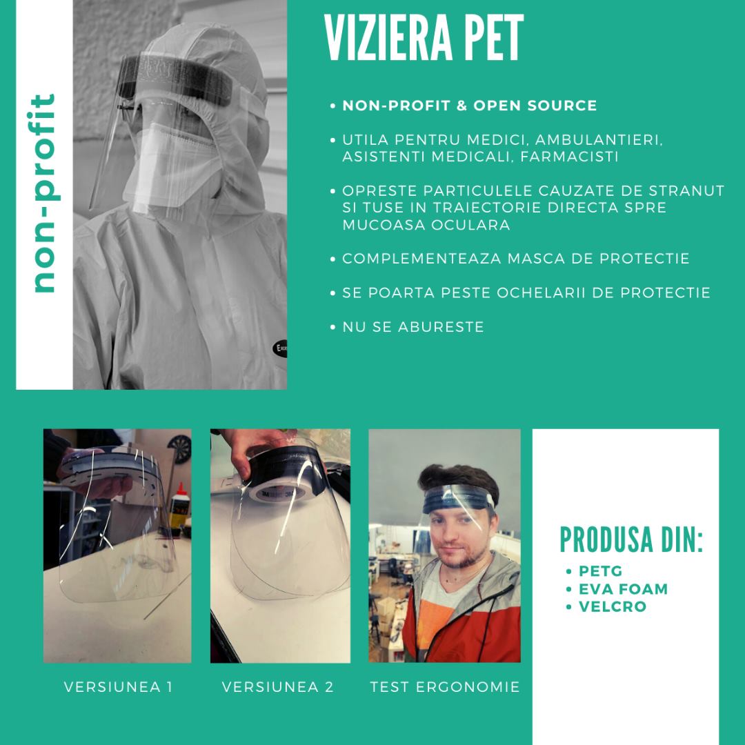 Viziera de protecție completează masca de protecție și se poartă peste ochelarii de protecție. Conform echipei care a realizat primele prototipuri, au reușit deja să fabrice 136 de viziere pe care le vor distribui către medicii din București pentru validarea lor. Aceasta a fost producția în prima zi.