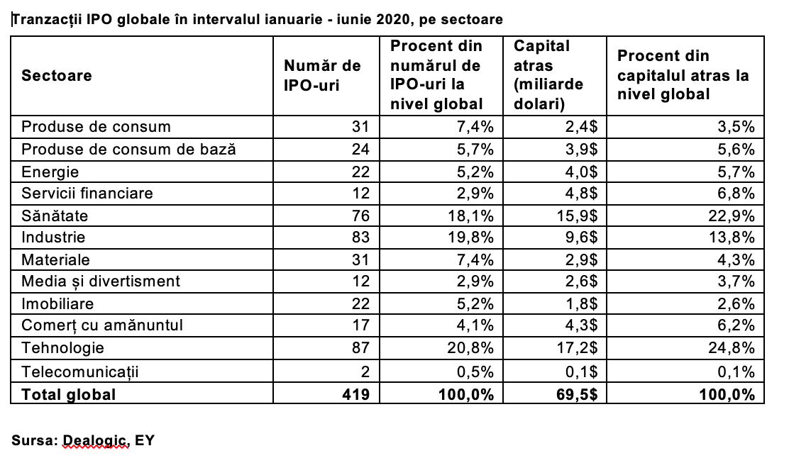 În cel de-al doilea trimestru din 2020, s-a înregistrat o diminuare a activității IPO față de perioada similară a anului 2019 în toate regiunile, atât ca număr de tranzacții, cât și sub aspectul capitalului atras.