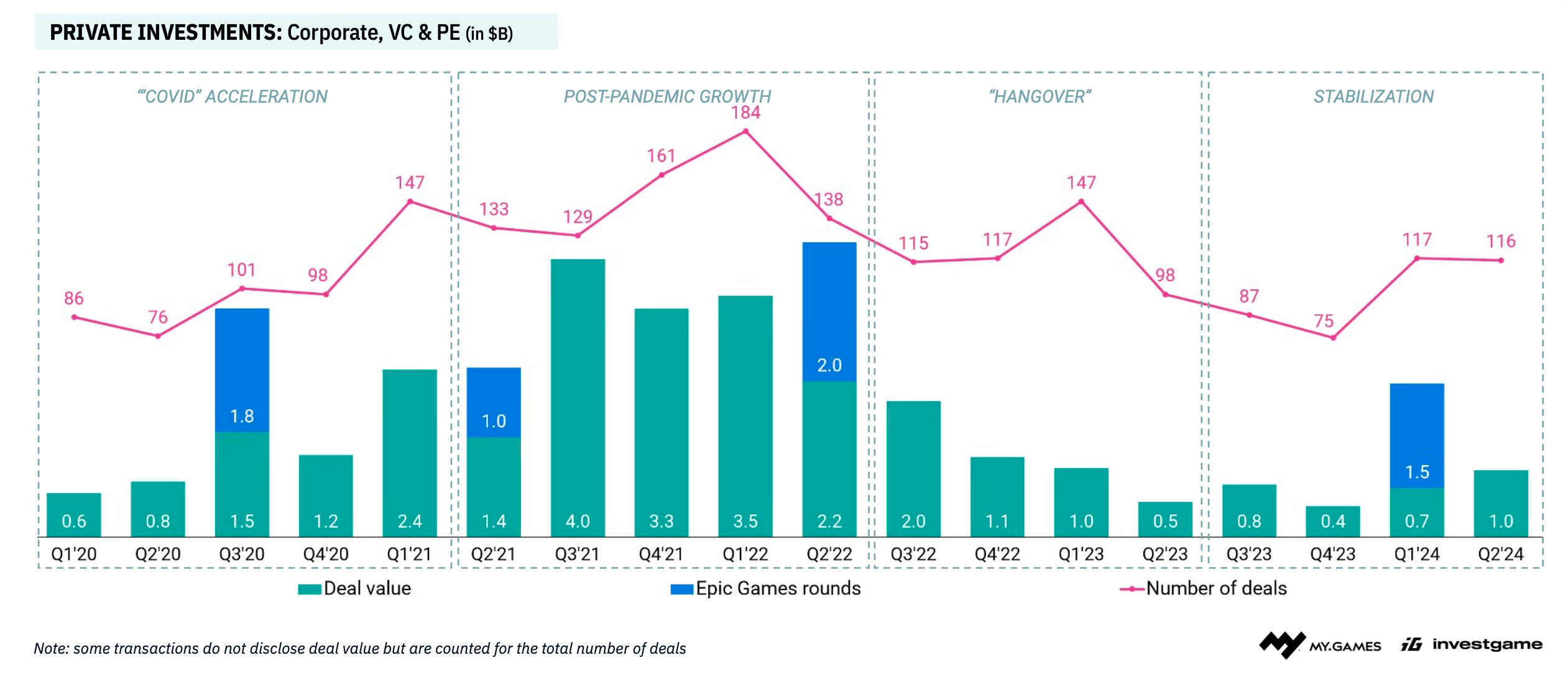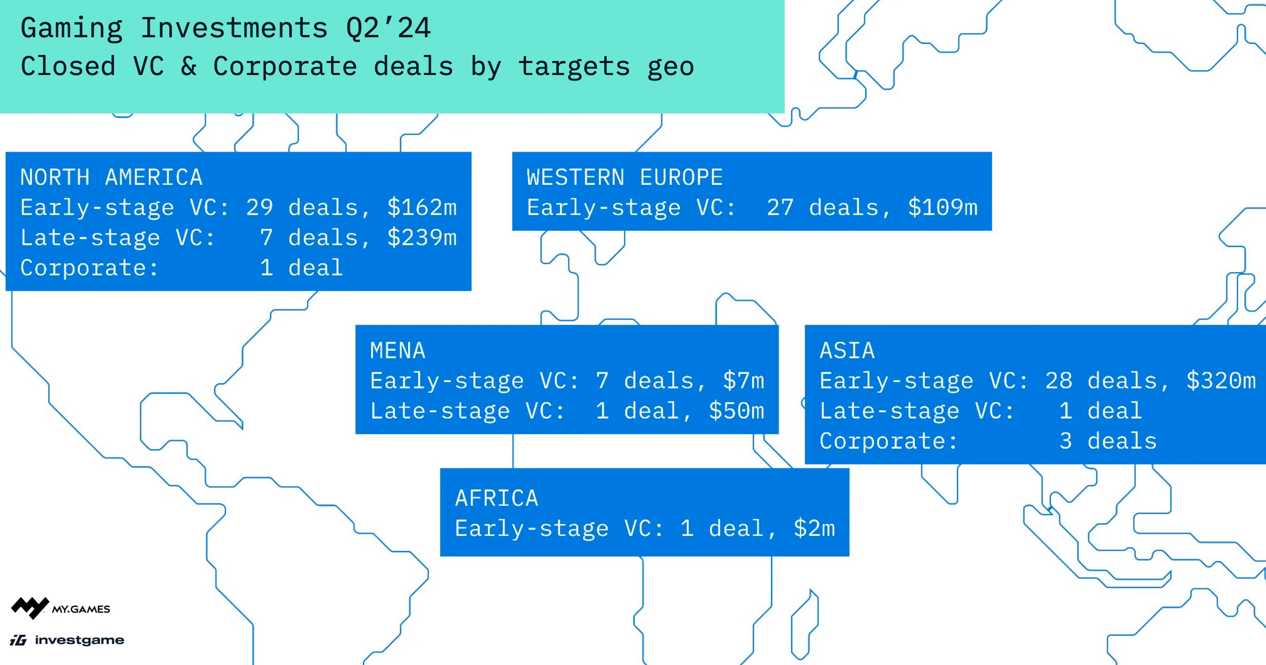 În T2'24 au avut loc 30 de tranzacții din domeniul jocurilor video în stadii incipiente (early stage), în valoare de 125 de milioane de dolari (73 de milioane de dolari pentru pre-seed; 52 de milioane de dolari pentru seria A). Se pare că piața atinge un nou nivel în ceea ce privește volumul și numărul de astfel de tranzacții.