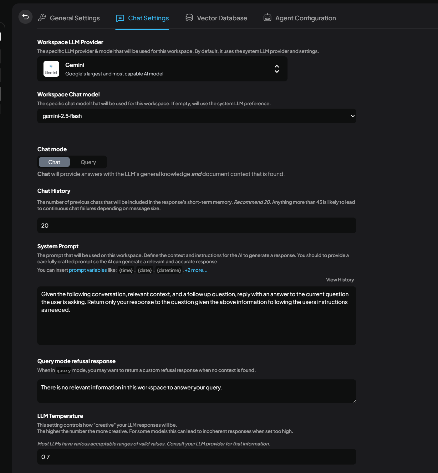 - AnythingLLM: Poate fi utilizat ca o interfață de chat (UI) pentru a interfața cu modelul dorit. Acesta permite utilizatorilor să construiască asistenți AI personalizați, încărcând documente, creând baze de cunoștințe personalizate și având interfețe conversaționale.