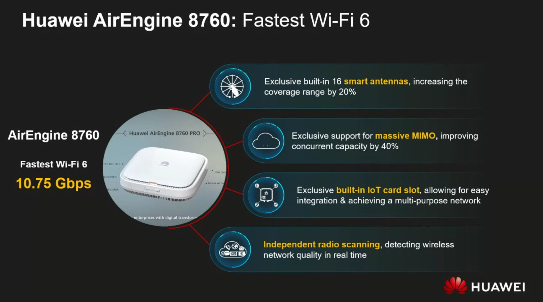 Un alt element care contribuie la această viziune de CloudCampus 3.0 este Huawei AirEngine 8760, un acces point cu Wi-Fi 6 ce ajunge la viteze de 10.75 Gbps, fiind cel mai rapid de pe piață din acest moment. Astfel de access point-uri ar putea fi instalate în birouri și ar putea susține nevoile angajaților. Un astfel de access point ar putea susține până la 100 de utilizatori în acealși timp.