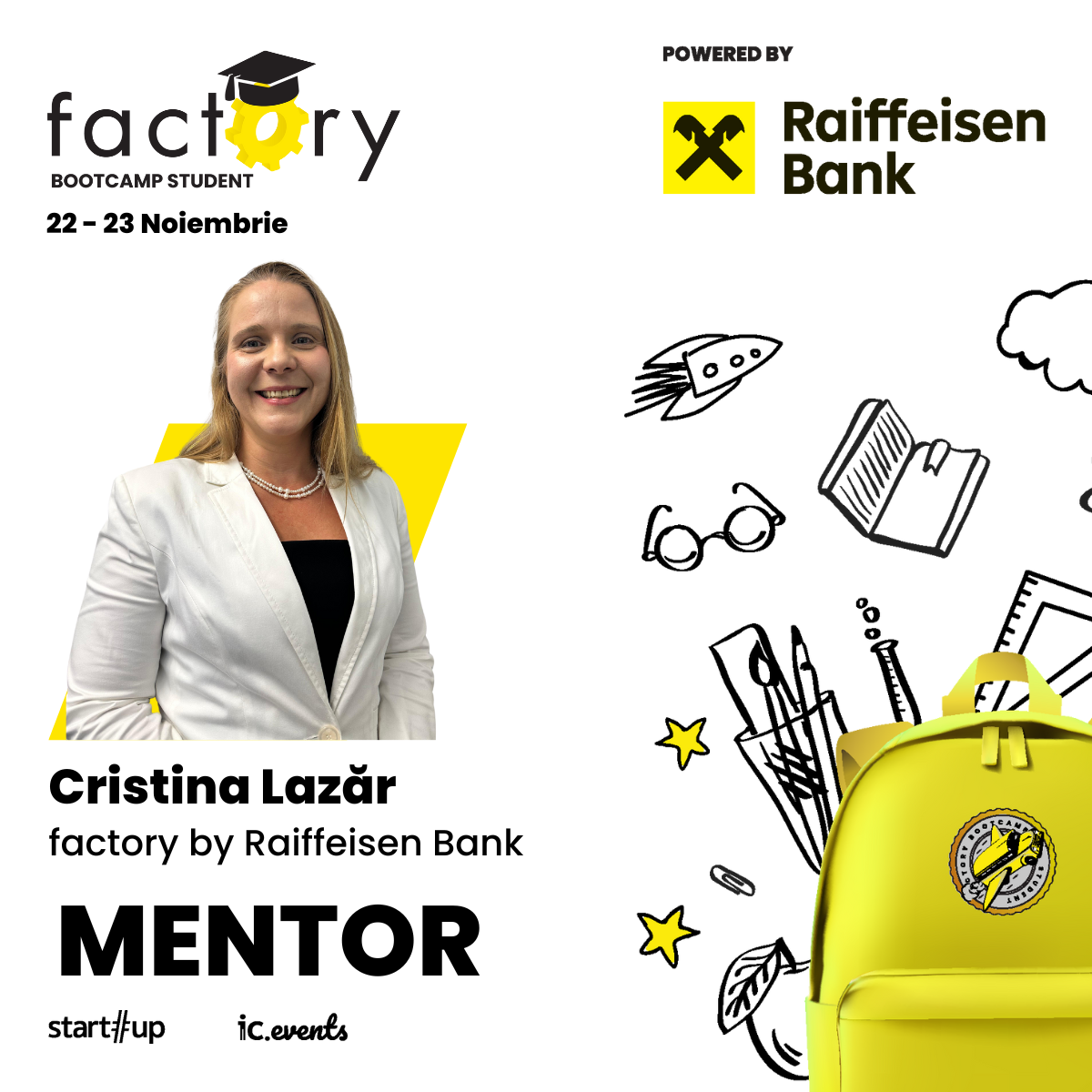 Cristina este Product Manager în cadrul factory by Raiffeisen Bank, un program destinat finanțării micilor antreprenori, pe care instituția financiară l-a lansat în urmă cu 6 ani.