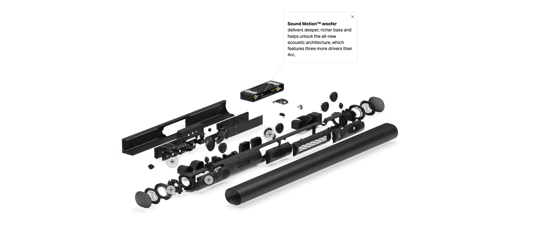 Cu o arhitectură complet nouă, acesta dispune de 14 difuzoare proiectate de Sonos, printre care un woofer Sound Motion și un grup de tweetere cu ghiduri de undă la ambele capete pentru a oferi o experiență audio spațială 9.1.4. Dacă vechiul Arc avea 11 difuzoare încorporate, acesta are 14 și astfel cei de la Sonos promit un sunet mai bun, mai multe detalii, o claritate mai bună și un bass mai profund.