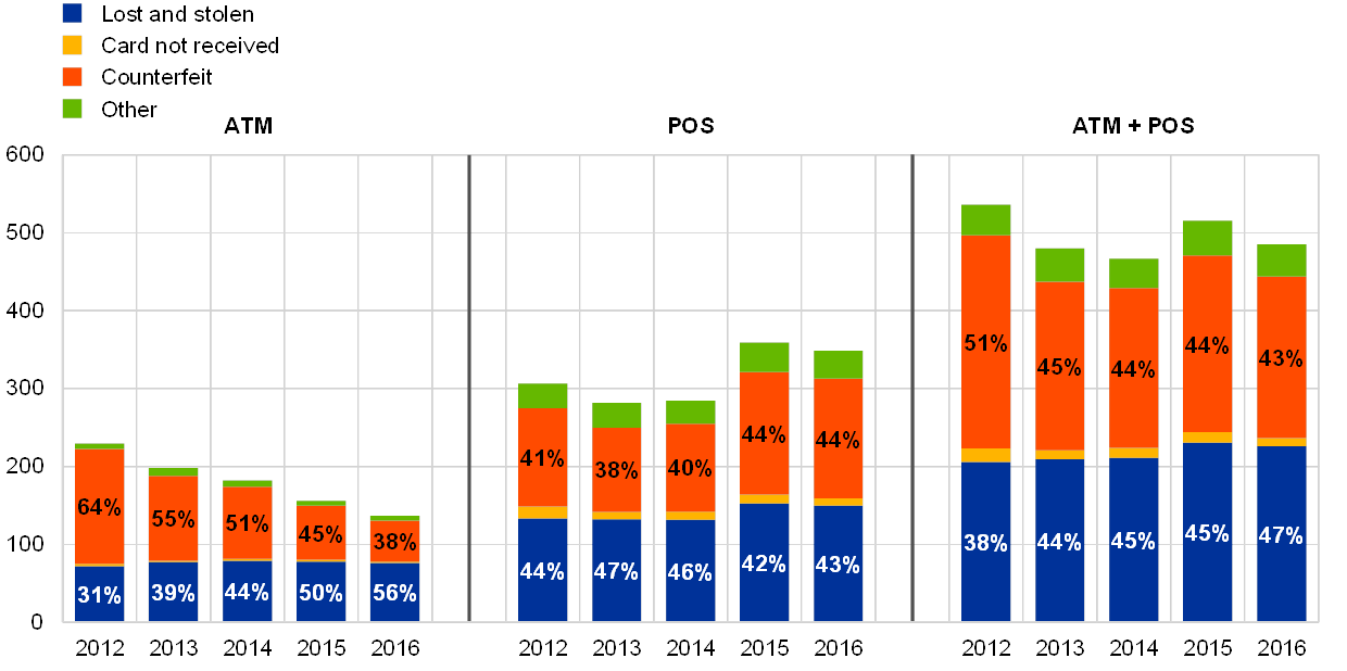 - Frauda în prezența cardului reprezintă 27% din valoarea fraudei cu carduri înregistrate la nivel european. Acest tip de fraudă se poate clasifica în continuare în fraudă la ATM și fraudă la POS. Majoritatea fraudelor de acest tip sunt comise folosind carduri clonate, realizate de infractori după ce aceștia au furat informațiile cardurilor, în timp ce a doua cauză o reprezintă cardurile pierdute sau furate.