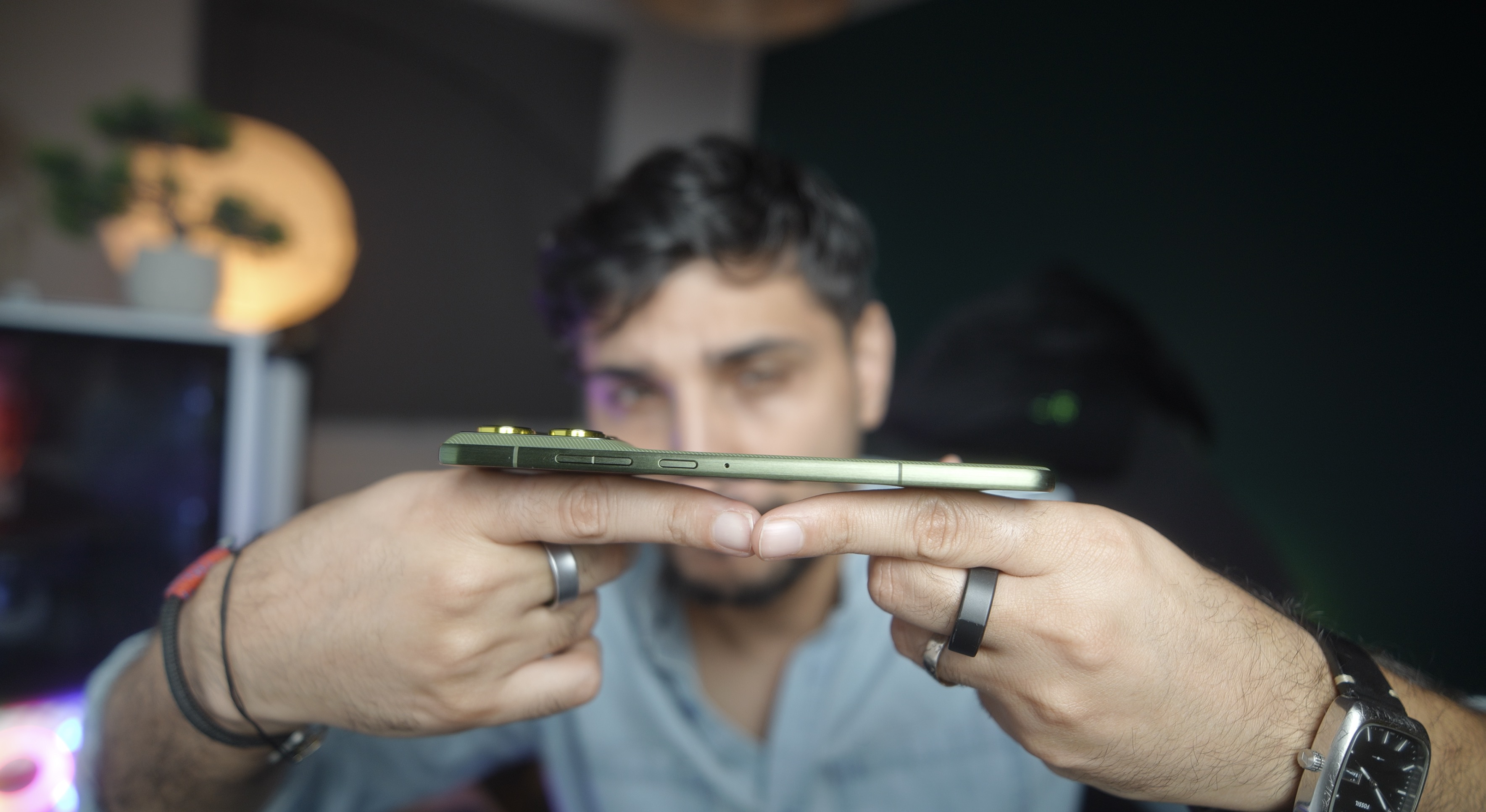 Pe spate avem obișnuitul sticker Pantone cu culoarea Bronze Green, care mie personal îmi place foarte mult. Rama din aluminiu este vopsită tot verde, iar telefonul are accente aurii pe modulul camerei și pe butonul de AI. Avem obișnuitele butoane pentru volum și pornire, dar aici sus avem și butonul pentru AI care poate fi apăsat mai lung pentru activarea Moto Ai sau o dublă apăsare pentru o anumită acțiune specifică de AI. Din păcate, nu poți reprograma acest buton pentru altceva, dar îi poți scoate funcția dacă nu-ți place sau nu o dorești.