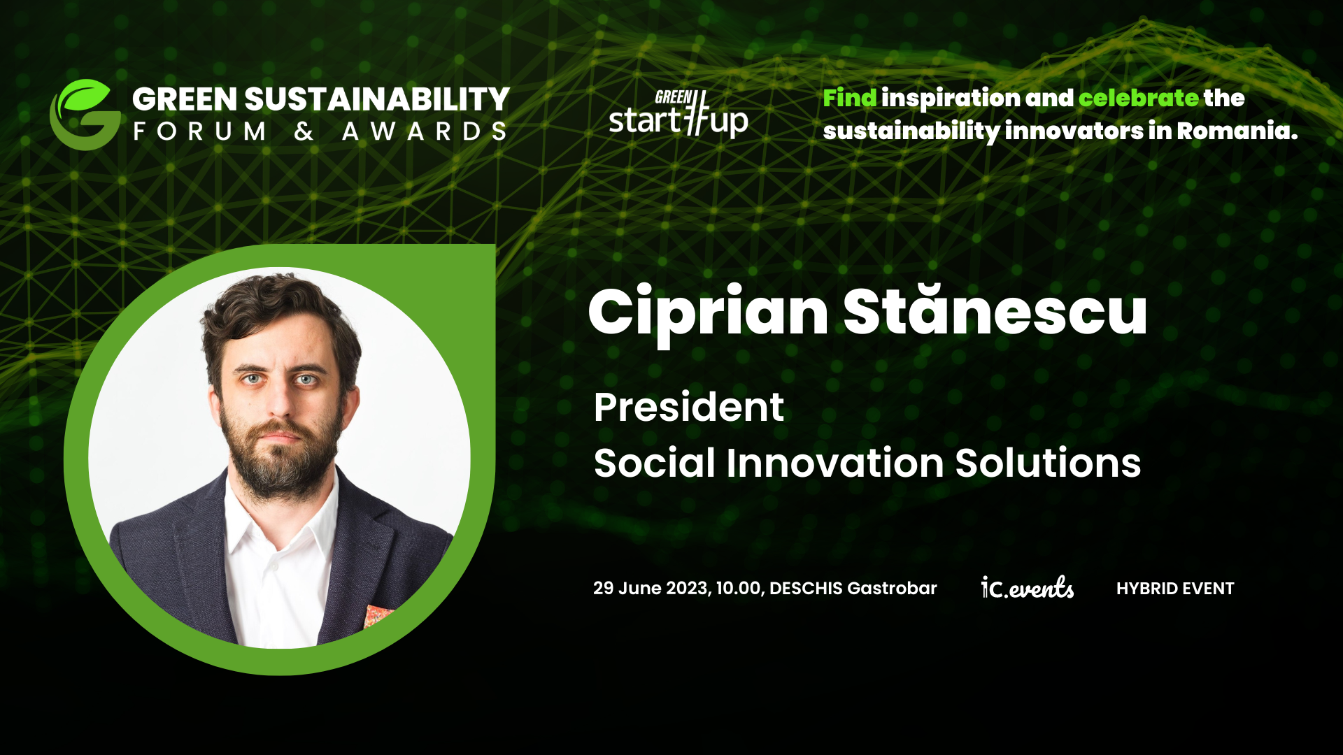Green Start-Up Sustainability Forum & Awards 2023 este un eveniment ce se va desfășura pe parcursul unei zile întregi, pe data de 29 iunie, la Deschis Gastrobar, în Capitală, începând cu ora 10.