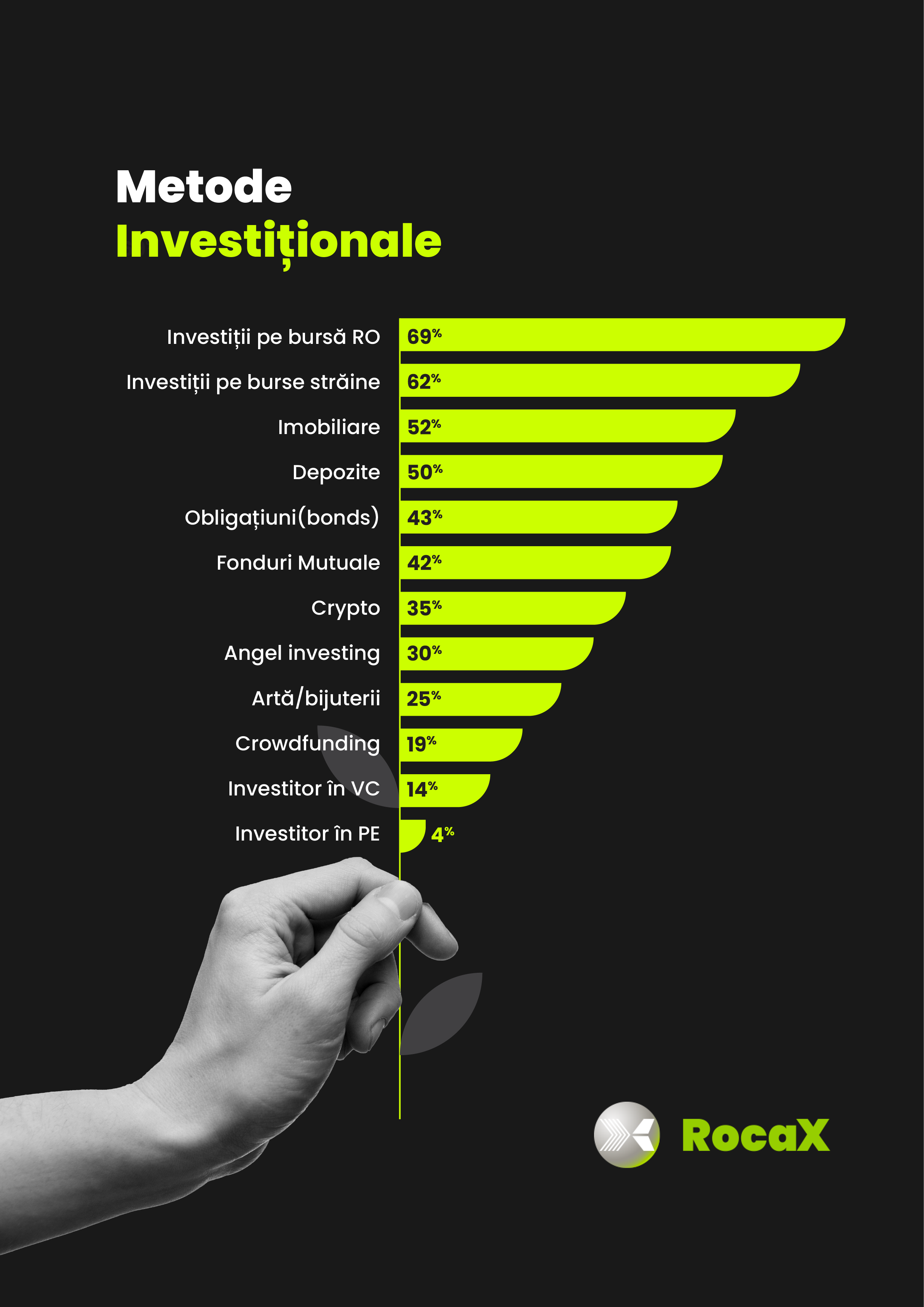 Metodele investiționale de tipul Angel Investing 30%, Crowdfunding 19%, Venture Capital 14%, Private Equity 4%, se află la coada clasamentului , în timp ce 34% dintre respondenți sunt investitori crypto, arată studiul ROCA X desfășurat la finalul anului trecut la care au răspuns 130 de investitori profesionali.