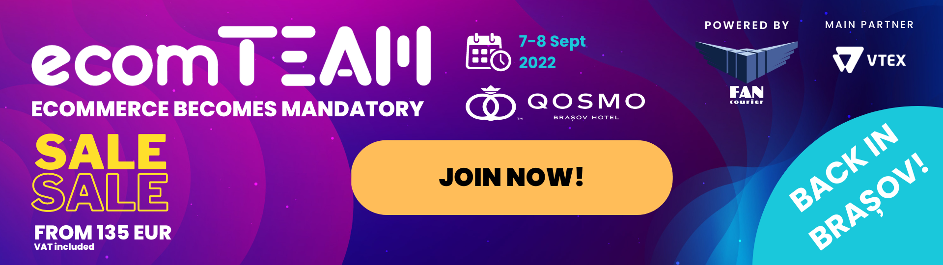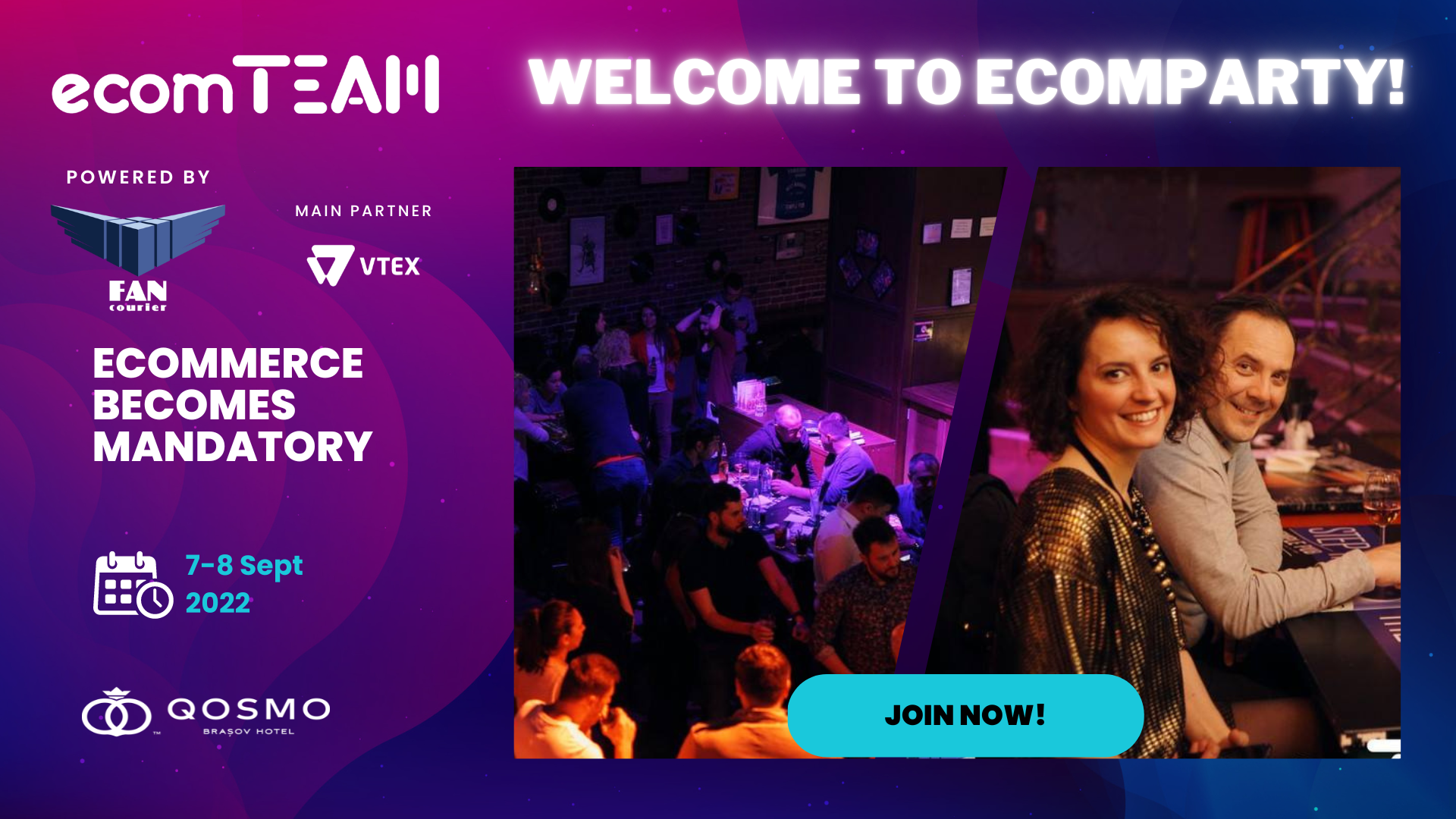 Este important să știi că, pentru prima dată la ecomTEAM, am creat pachete de bilete cu experiență completă, care includ cazare la hotel Qosmo și acces la ecomTEAM Party, petrecerea care va avea loc în seara zilei de 7 septembrie și care reprezintă ocazia ideală de networking.