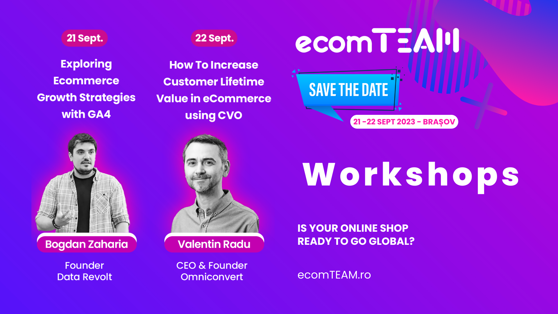 Avem două zile dedicate e-commerce-ului la ecomTEAM 2023 pe 21 și 22 septembrie. Paneluri, prezentări și worksop-uri care te vor ajuta să îți duci magazinul online la alt nivel, dar si în alte piețe.