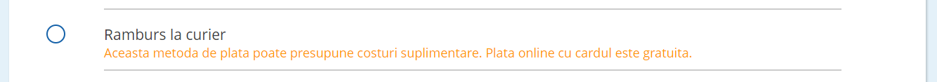 În dreptul rubricii ”Plata ramburs”, eMAG afișează acum următorul mesaj: ”Ramburs la curier - Aceasta metoda de plata poate presupune costuri suplimentare. Plata online cu cardul este gratuita”. După bifarea opțiunii, textul se schimbă în ”Taxa pentru procesarea platii la livrare: 5 Lei. Plateste cu cardul online si evita costurile suplimentare. Vei plati in momentul in care comanda va fi livrata”. Prețul produsului este apoi actualizat.