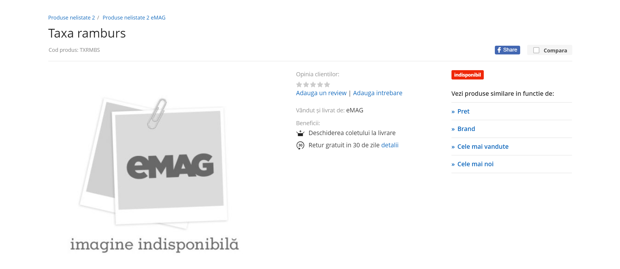 Amuzant este faptul că pe site-ul eMAG există o listare pentru ”Taxa ramburs”, ca și cum ar fi un produs. Aceasta pagină apare dacă faci o căutare cu ”Taxa ramburs eMAG” pe Google.