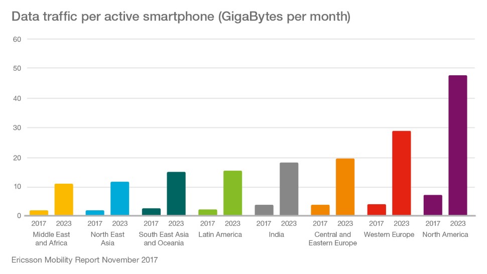 Astfel, în opininia specialiștilor Ericsson, traficul mobil de date la nivel global este așteptat să crească de opt ori până în 2023, ajungând până la 110 exabiți pe lună. Practic, această cantitate lunară este echivalentul a 5,5 milioane de ani de difuzări video HD.