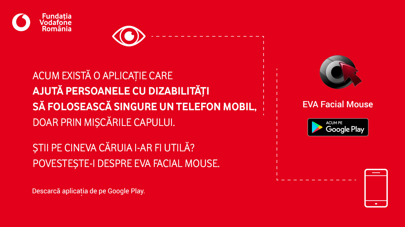În România, aplicația EVA Facial Mouse va fi adusă în atenția potențialilor beneficiari prin organizații partenere ale Fundației Vodafone România care dezvoltă proiecte pentru persoane cu dificultăți neuromotorii: Fundația Motivation Romania, Mihai Neșu Foundation, Asociaţia Şcoala Mamei Junior, Asociaţia SM Speromax Alba.