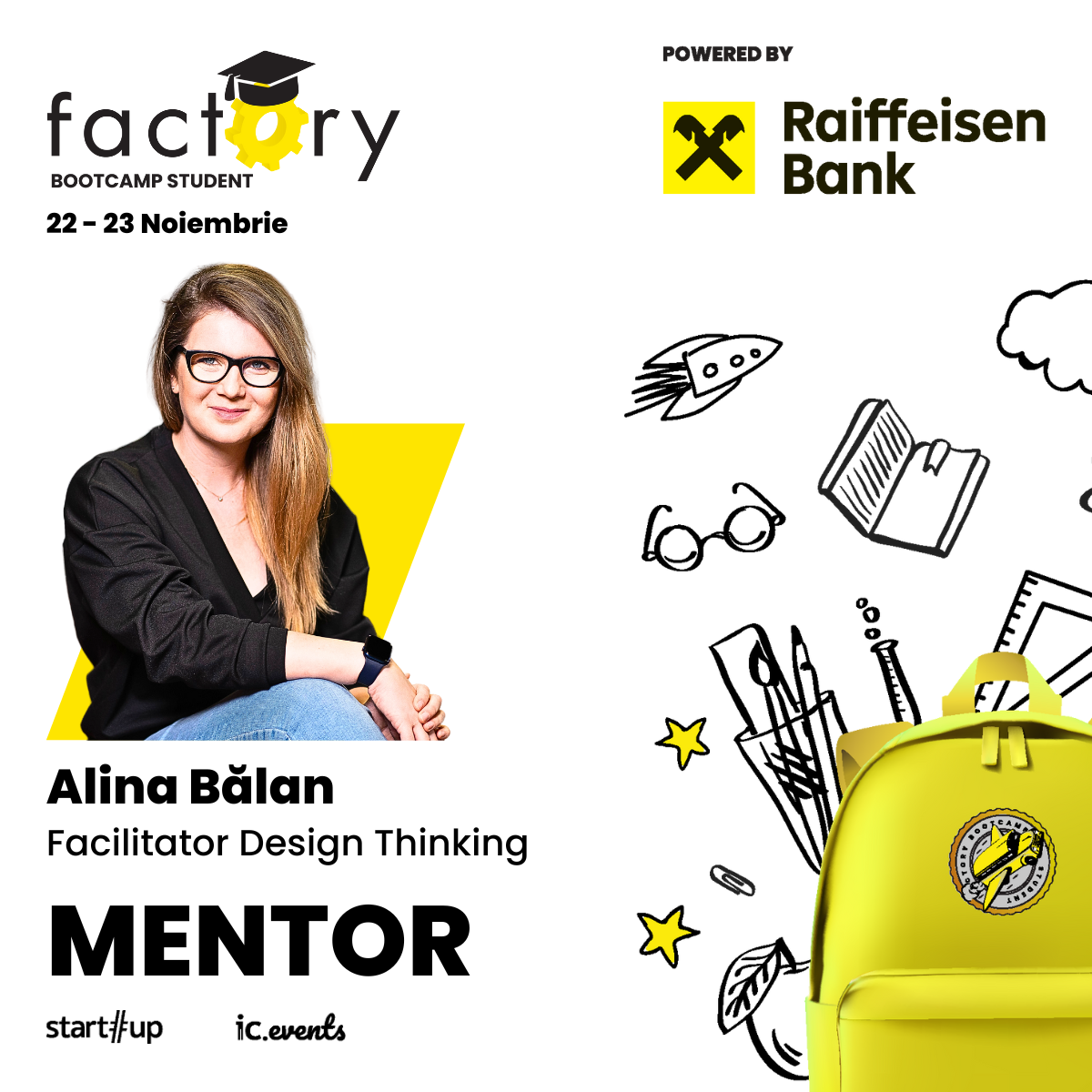 Alina Balan este un facilitator cu o experiență vastă în dezvoltarea de experiențe, servicii și produse „human-centered”, utilizând metode colaborative precum Design Thinking. Absolventă EMBA la Maastricht School of Management, Alina aduce perspective complexe de business în proiectele sale.