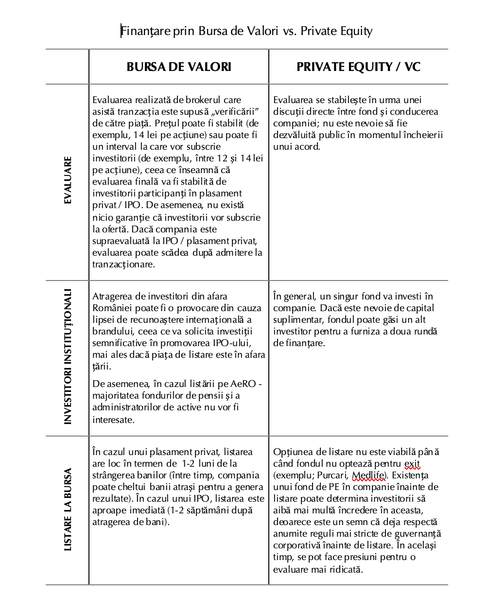 Documentul în care sunt explicate pe larg diferențele dintre finanțarea prin private equity și listarea pe bursă poate fi consultat mai jos.